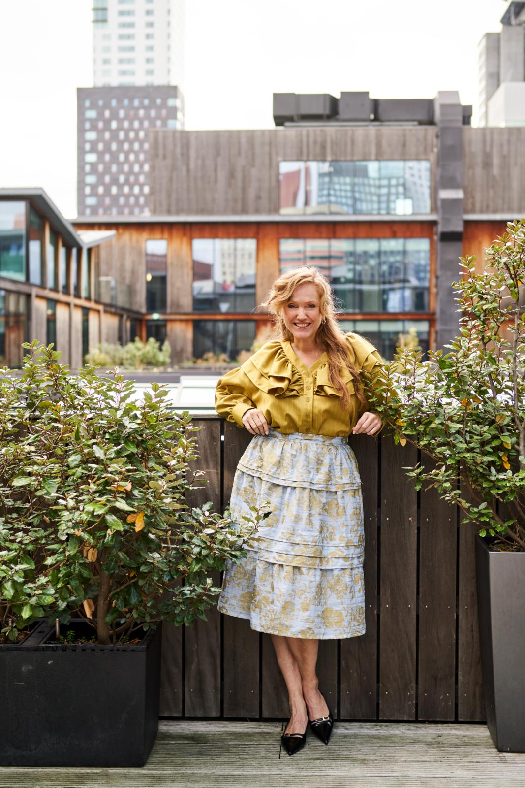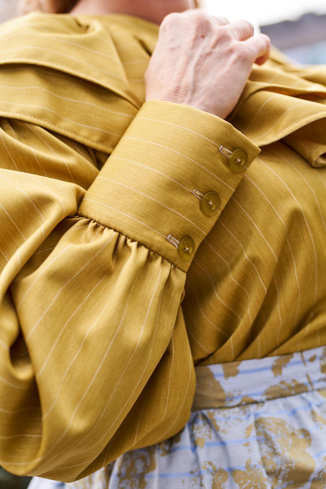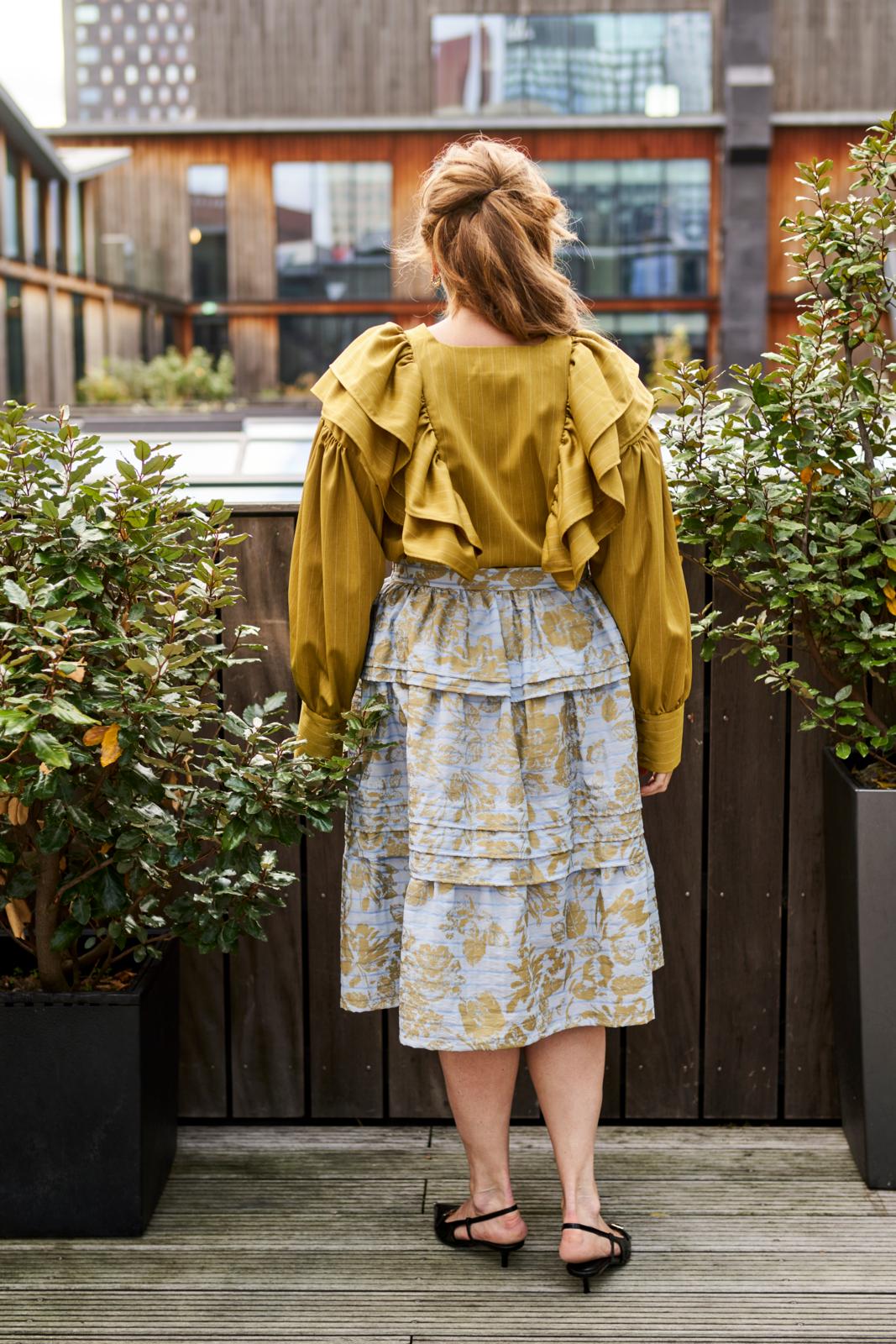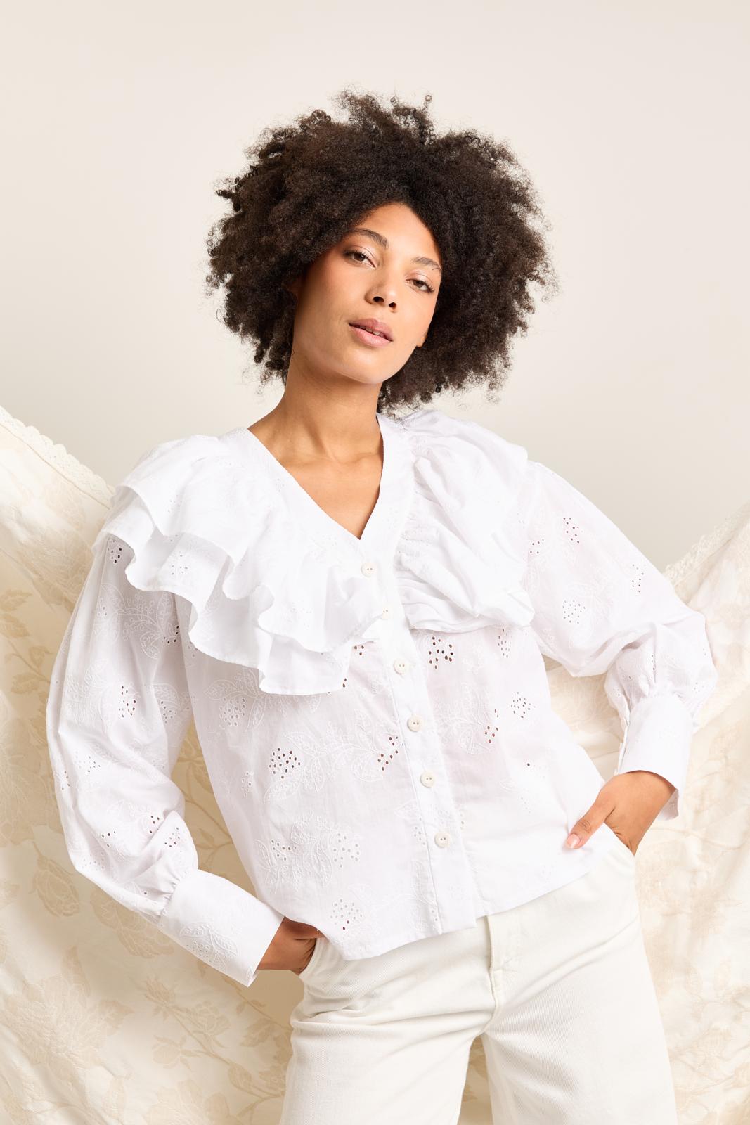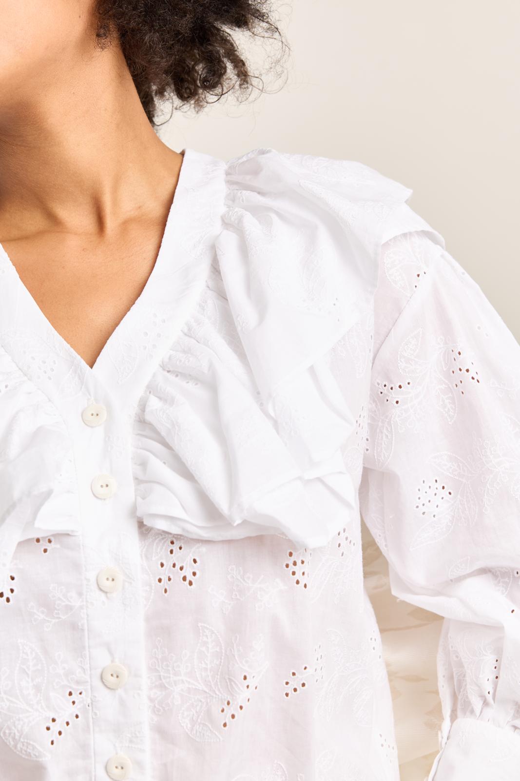Ga all the way romantisch met ruches, plooi- en rimpeldetails in je outfit. Deze blouse met een dubbele ruche als kraag is daar perfect voor! De dubbele ruche loopt naar achter door en wordt tussen de deelnaden gestikt. De lange manchetten sluiten met drie knoopjes.