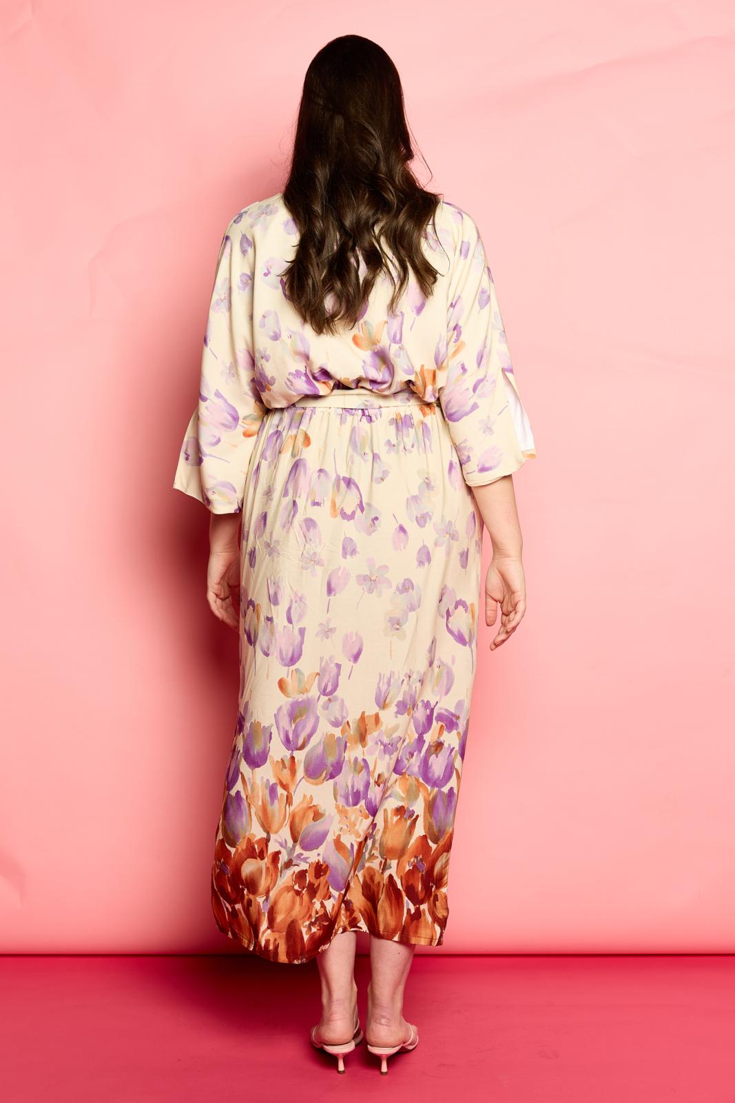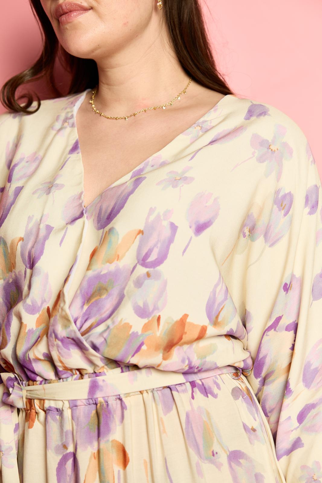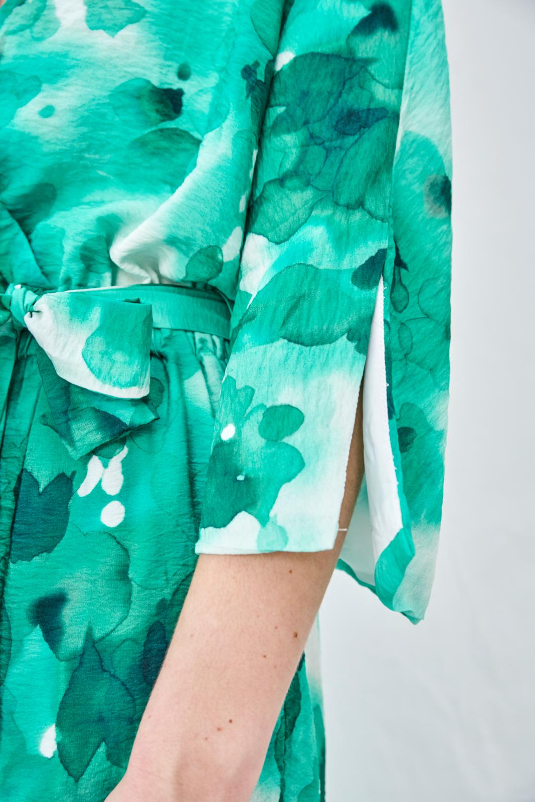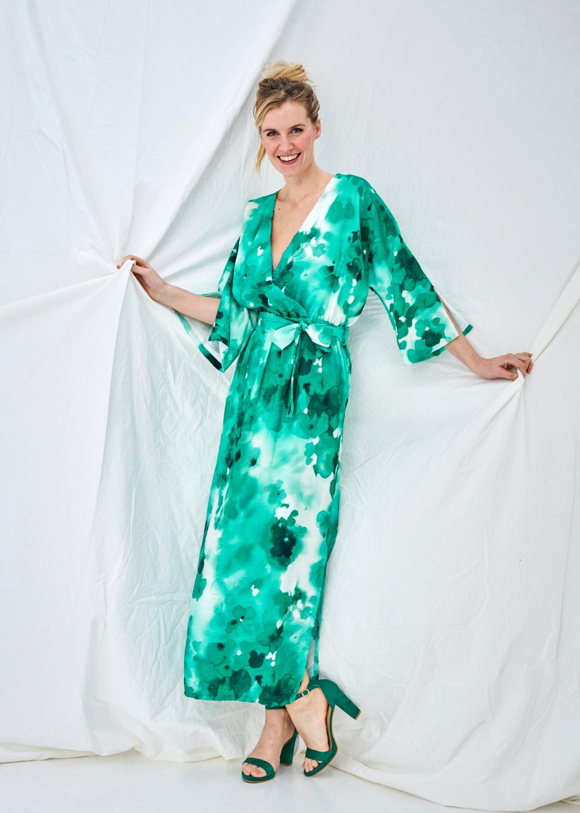 Dit kimonomodel is een typisch geval van ‘easy elegance’. Een eenvoudige jurk met veel uitstraling door het overslageffect en de grote splitten in de mouwen. Het lijfje (de bovenkant) van de jurk is gevoerd voor een mooie afwerking. In de taille wordt elastiek gezet. De bijpassende strikceintuur is optioneel.