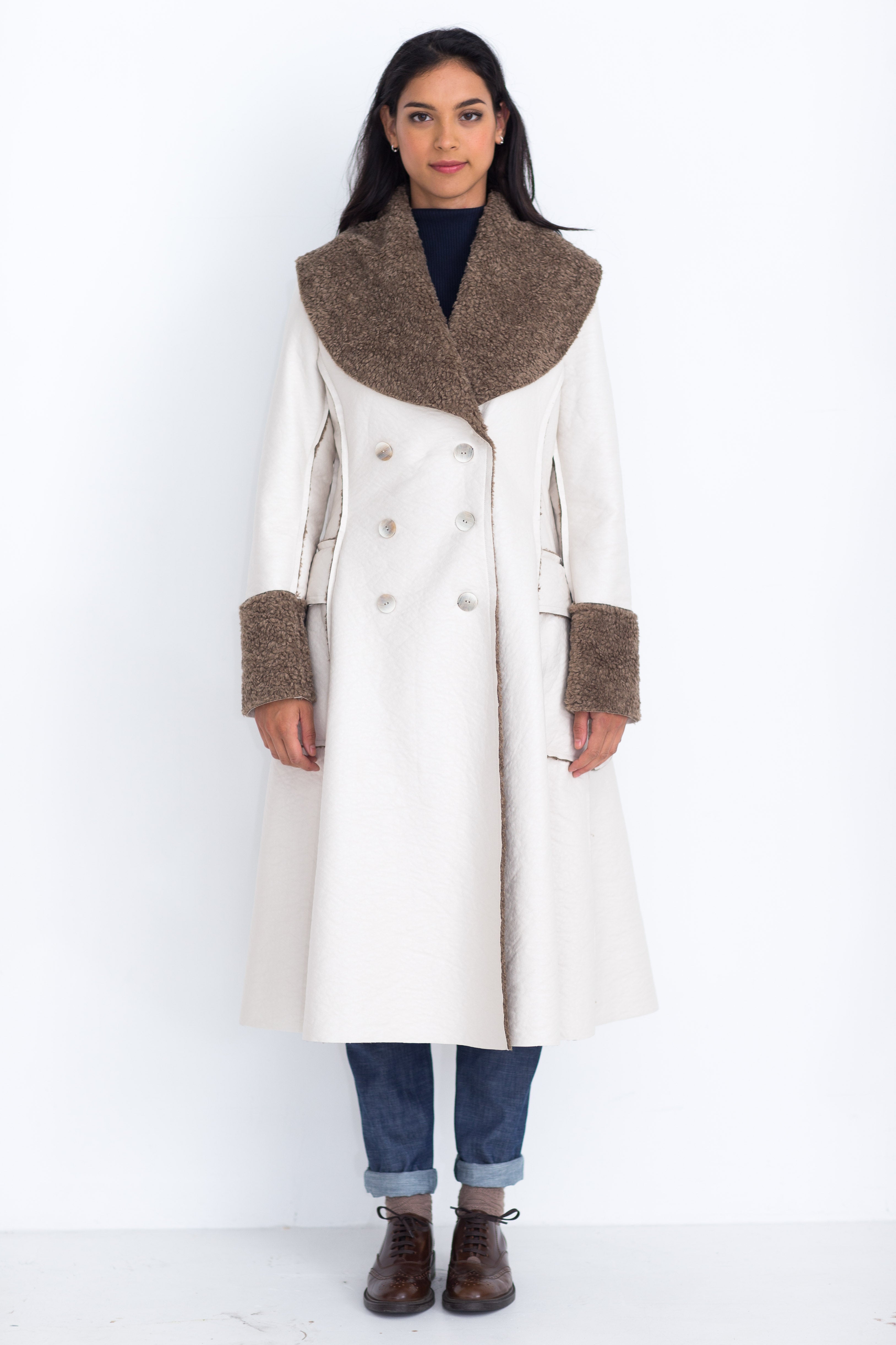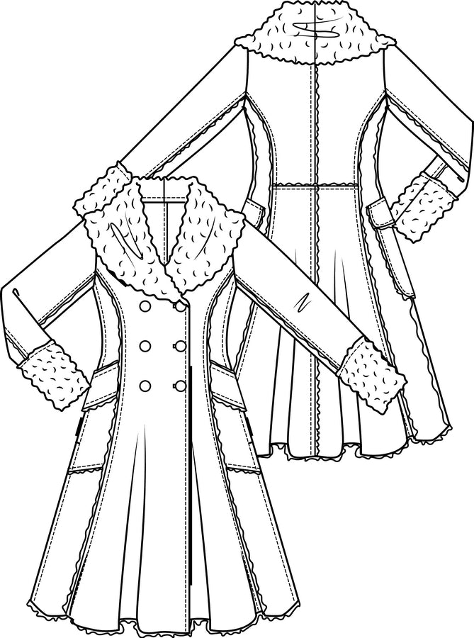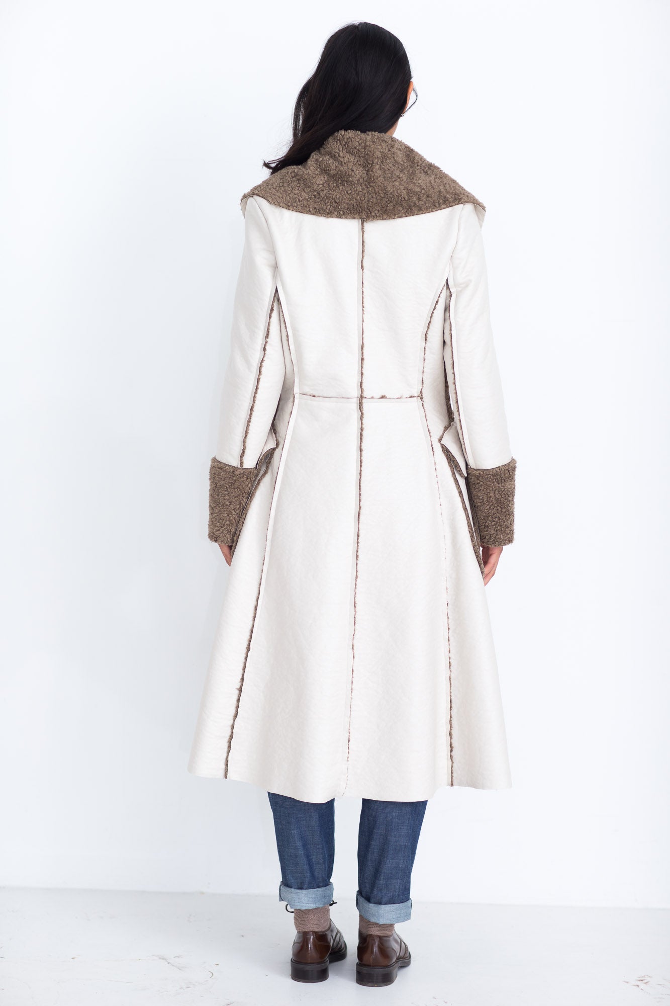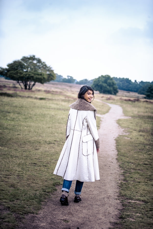 De elegante winterjas van imitatielammy heeft opgestikte klepzakken die naar achter doorlopen. De deelnaden zijn op de goede kant gestikt waardoor de onafgewerkte bontrandjes zichtbaar zijn.