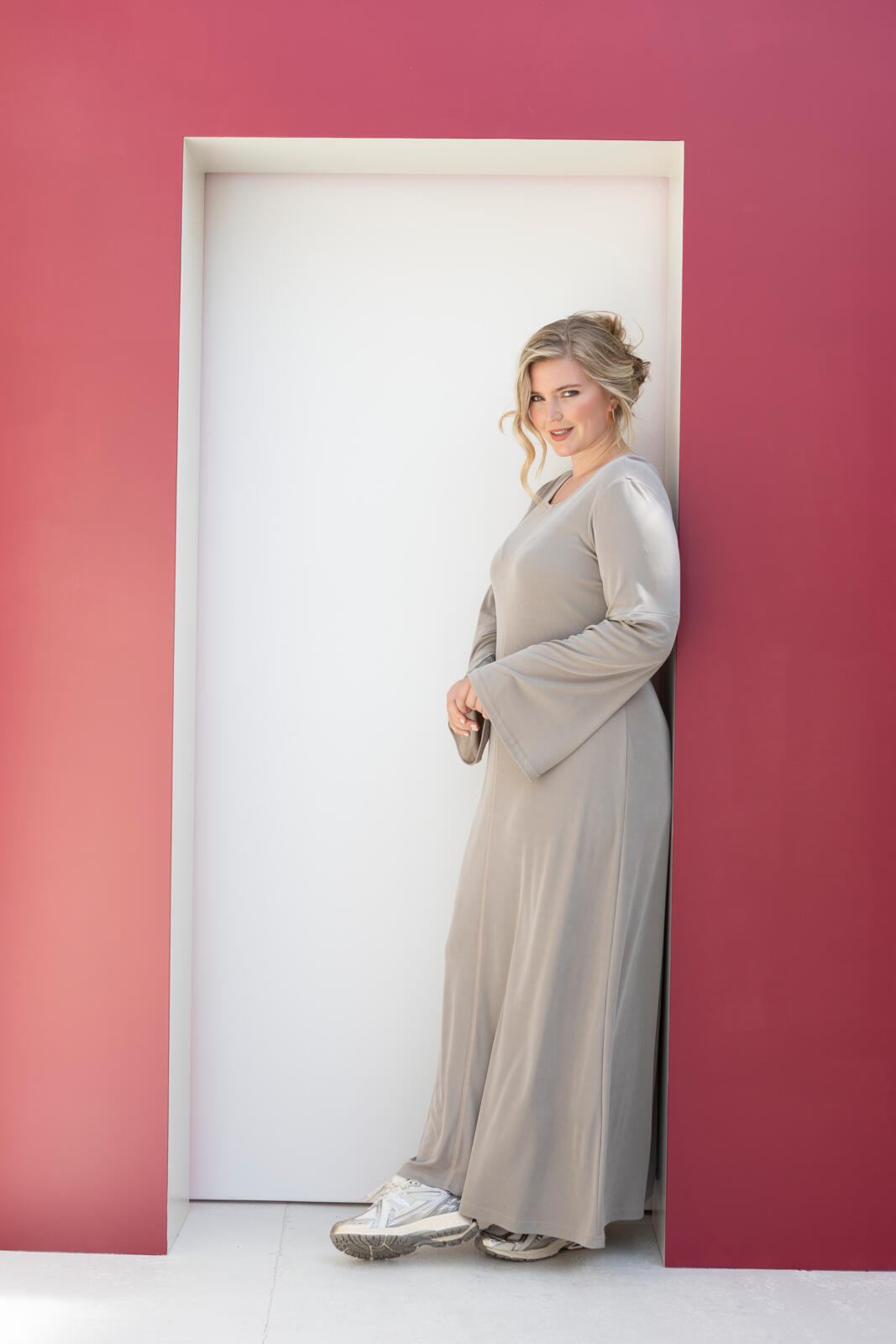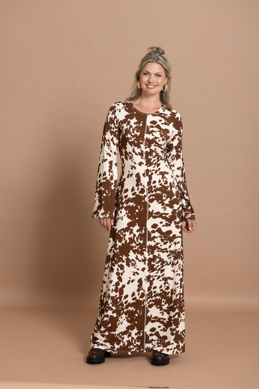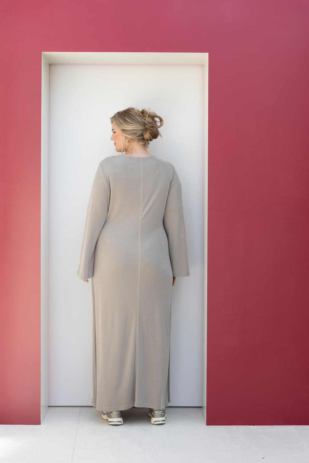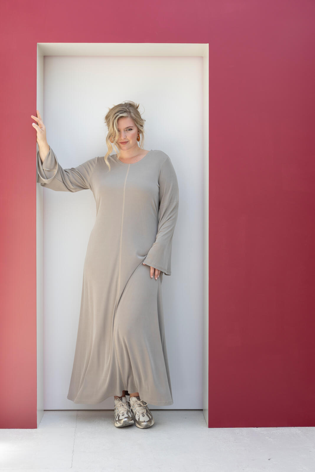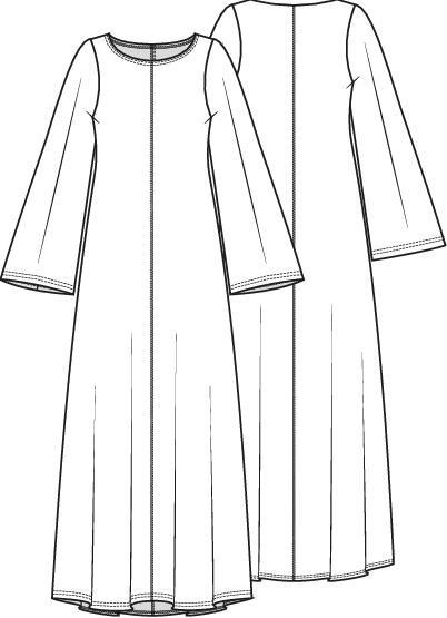 Een sluik, ruimvallend model maxi-jurk met uitlopende mouwen. Hij wordt gemaakt van tricot of steviger jersey. Middenvoor zit een lockstiksel voor de sier, waardoor de jurk minder massief oogt. Geen lockmachine in huis? Een zigzag- of stretch-steek kan ook. Je kunt er ook een knielange versie van maken.