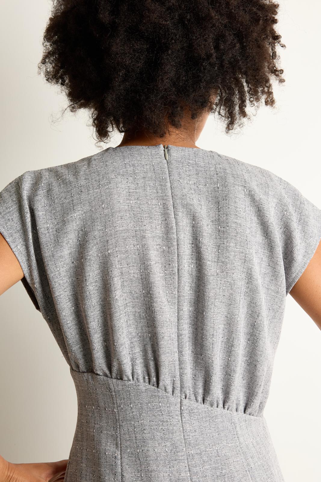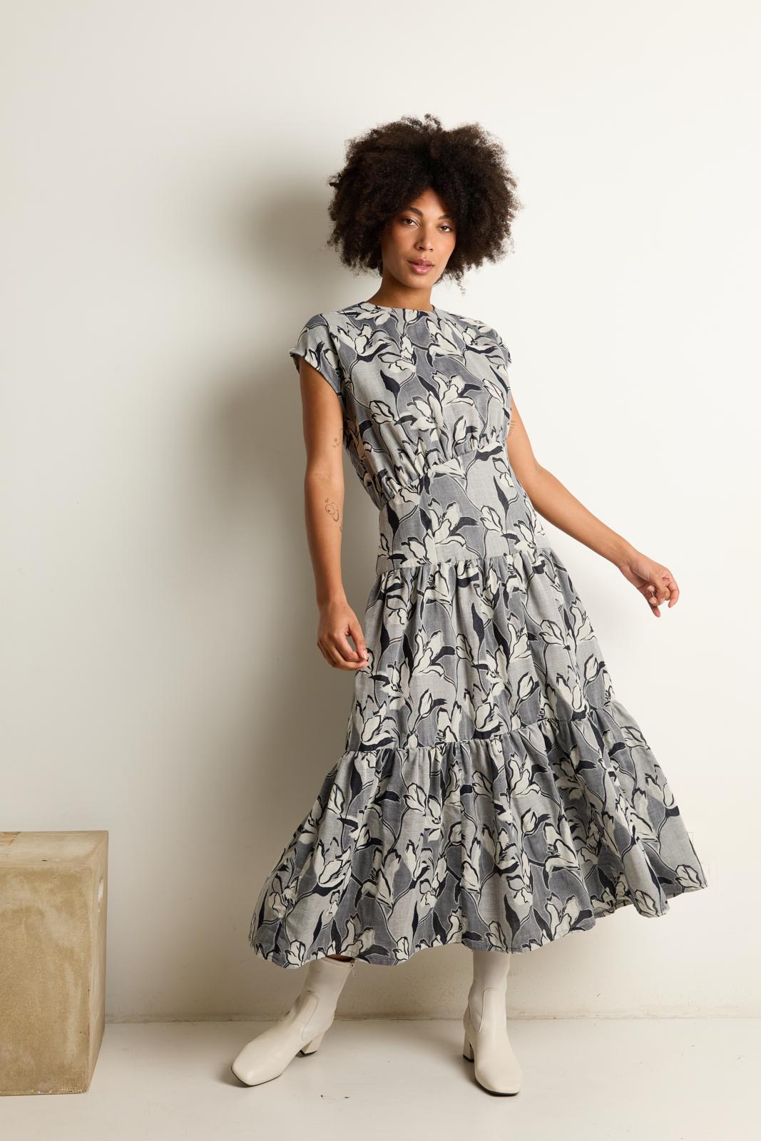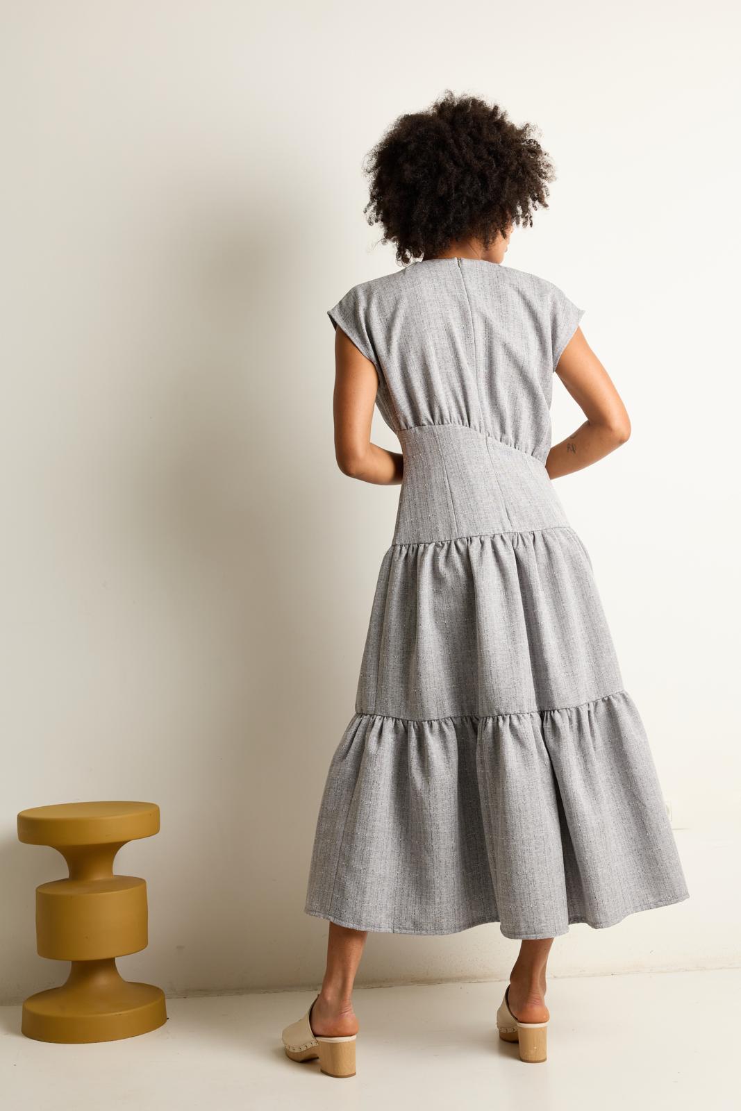 Deze jurk bezorgt je een extra mooi silhouet. Dat komt door het slanke taillestuk (dat compleet gevoerd is), het lijfje met aangeknipte mouwtjes en de wijde rok. Achter heeft de jurk een blinde rits. De rok bestaat uit gerimpelde banen.