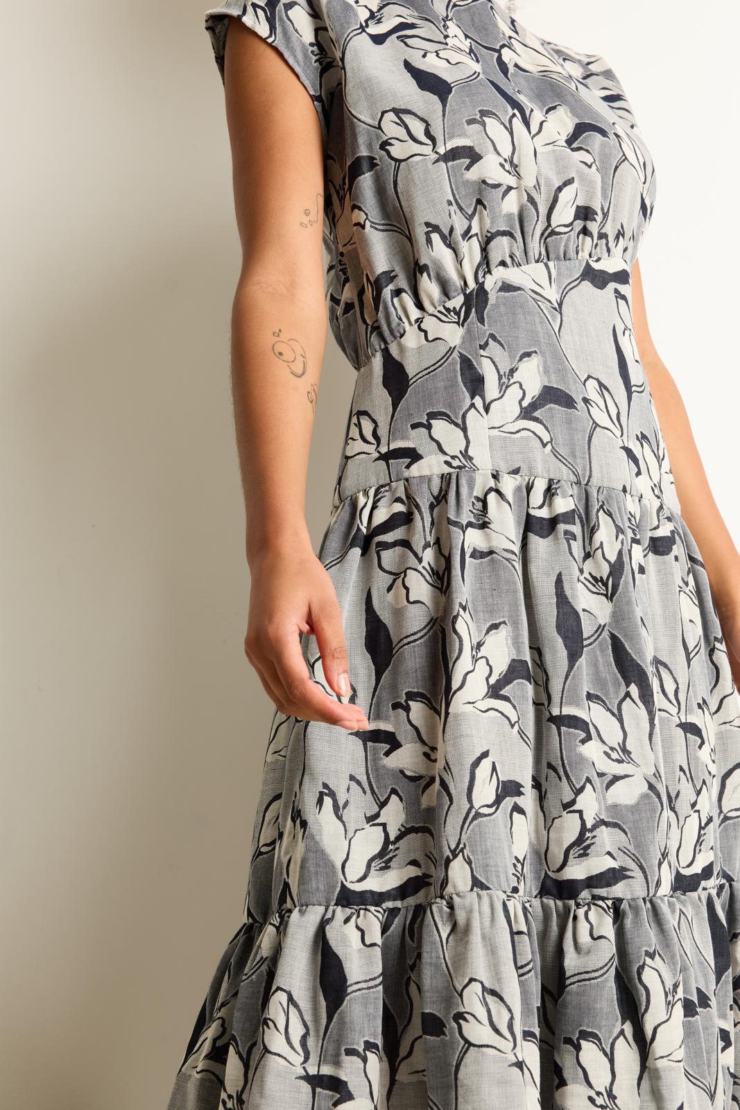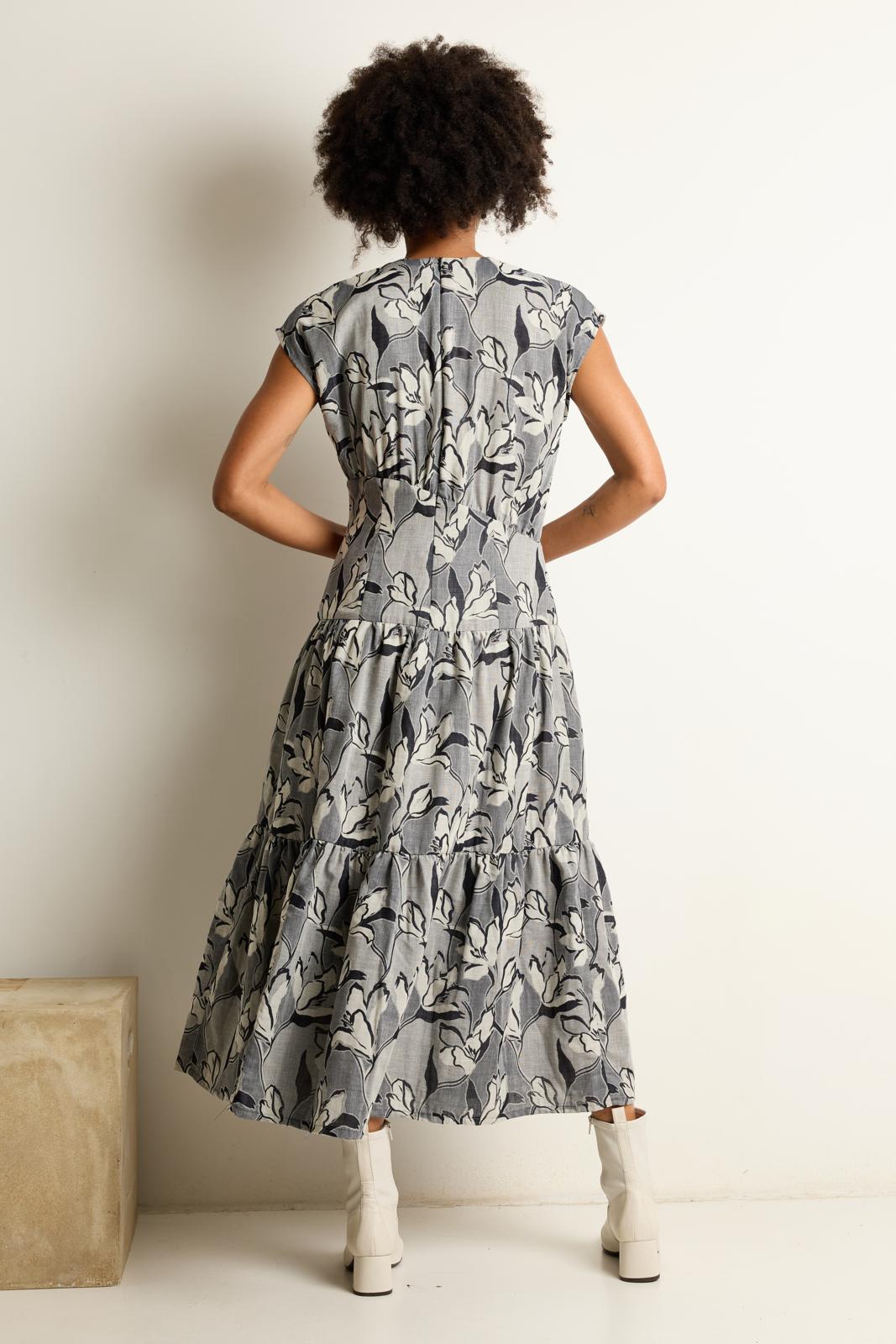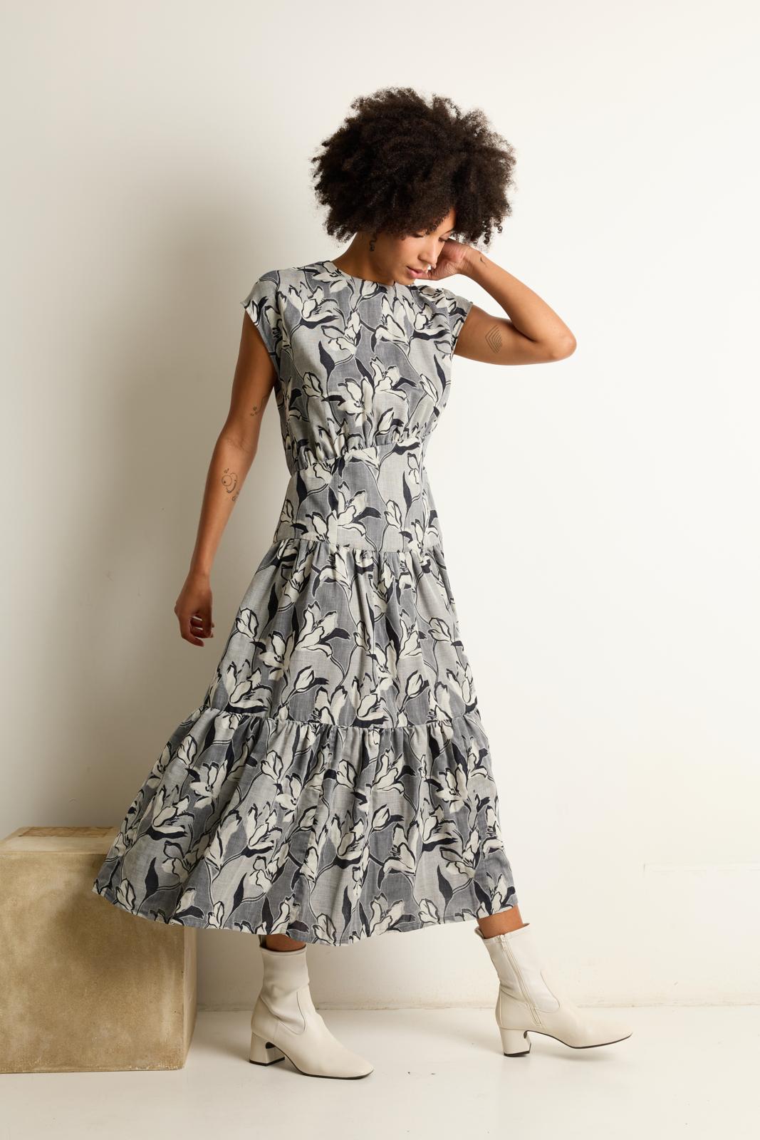 Deze jurk bezorgt je een extra mooi silhouet. Dat komt door het slanke taillestuk (dat compleet gevoerd is), het lijfje met aangeknipte mouwtjes en de wijde rok. Achter heeft de jurk een blinde rits. De rok bestaat uit gerimpelde banen.