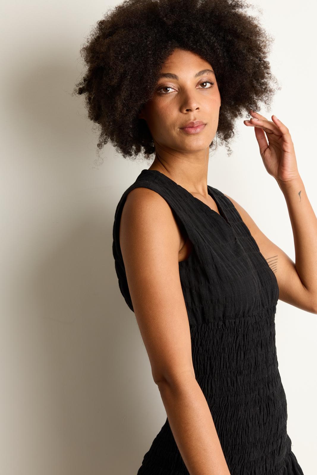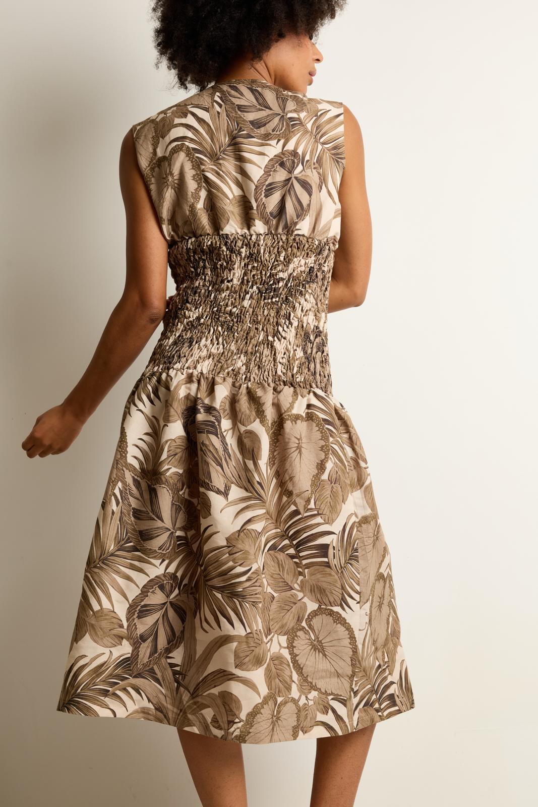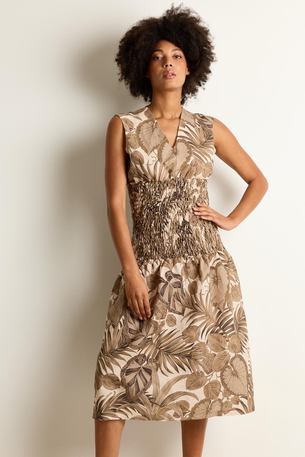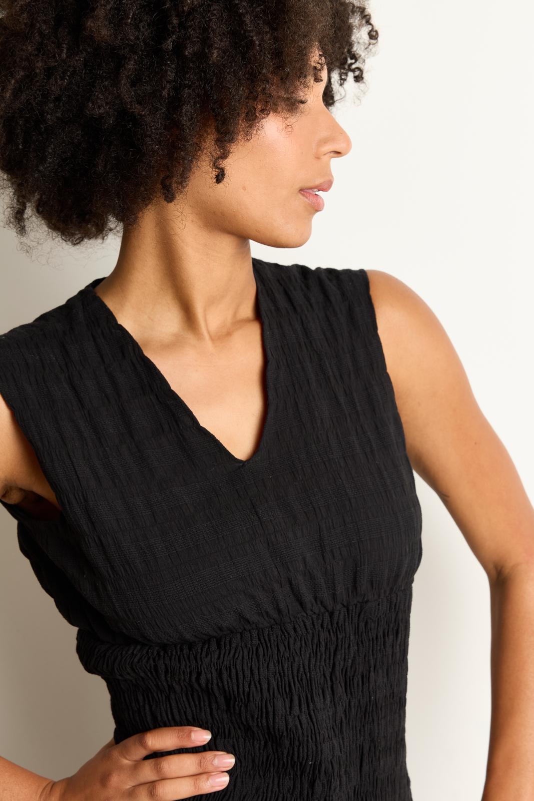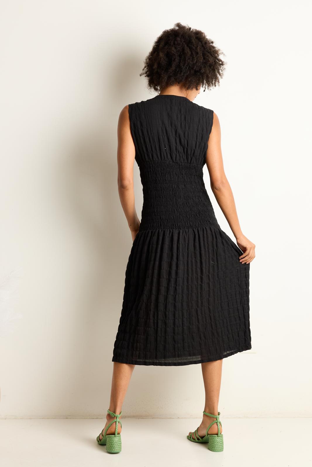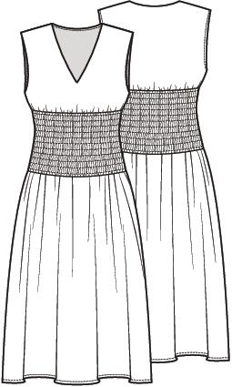 Het slanke taillestuk krijgt deze jurk door smokwerk dat je maakt met de naaimachine. Een rits is door al dat elastiek niet nodig. De jurk van zwarte seersucker is perfect voor een geklede stijl, die met botanische print voor de vakantiekoffer. Het lijfje is gevoerd voor een mooie afwerking van de halslijn en armsgaten.
