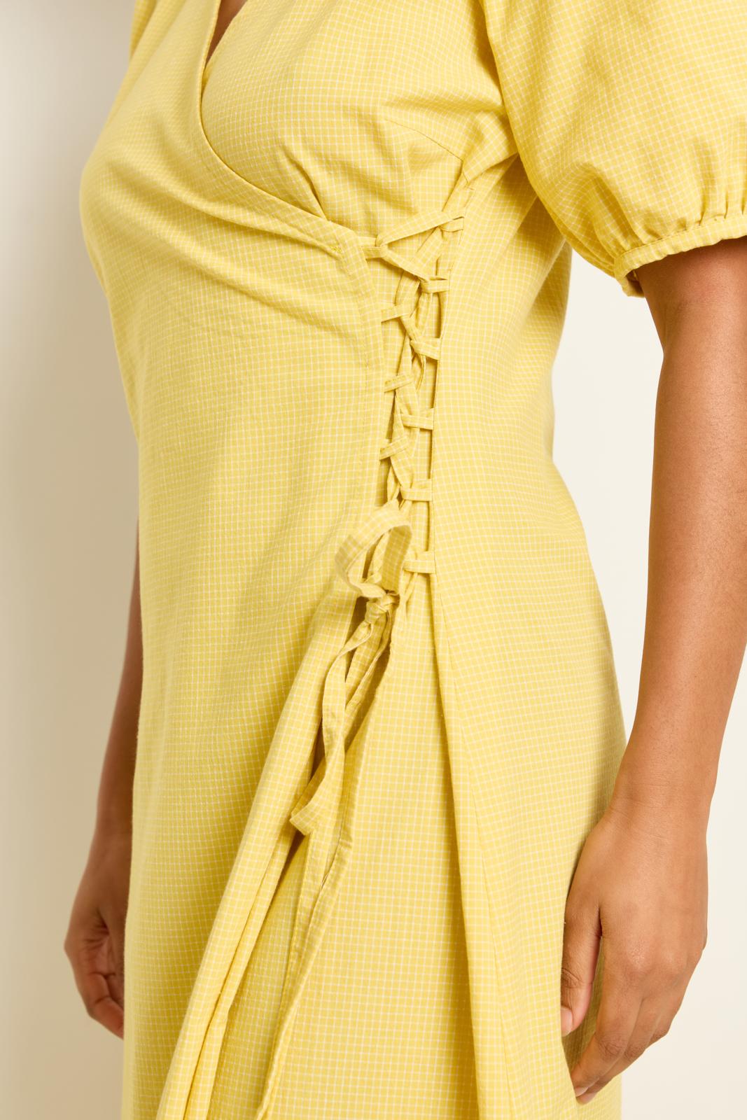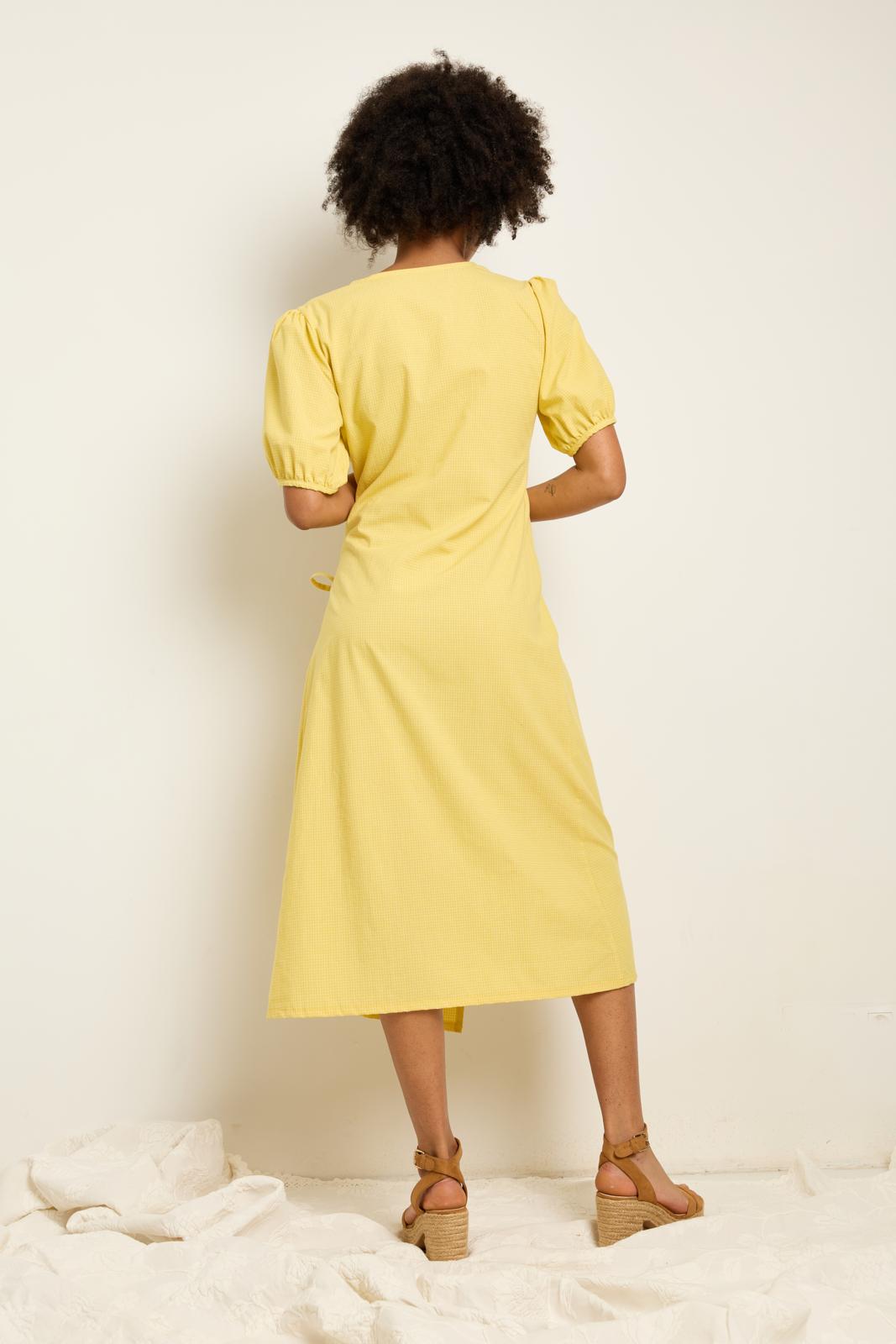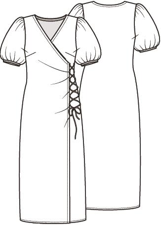Een jurk met een overslageffect met lusjes en ‘lintsluiting’. Je trekt dit model over het hoofd aan en trekt de rijgveter dan iets strakker aan. Maak hem eventueel wat korter als een lengte rondom de knie je beter staat. Je kunt deze jurk ook maken met de lange mouwen van top 24.
