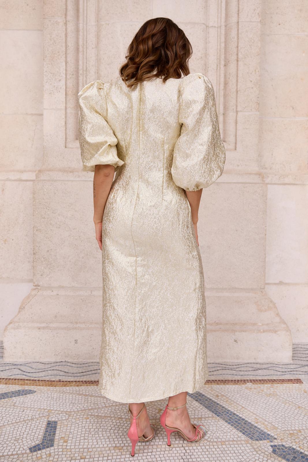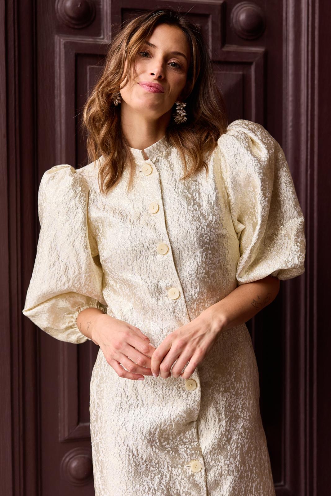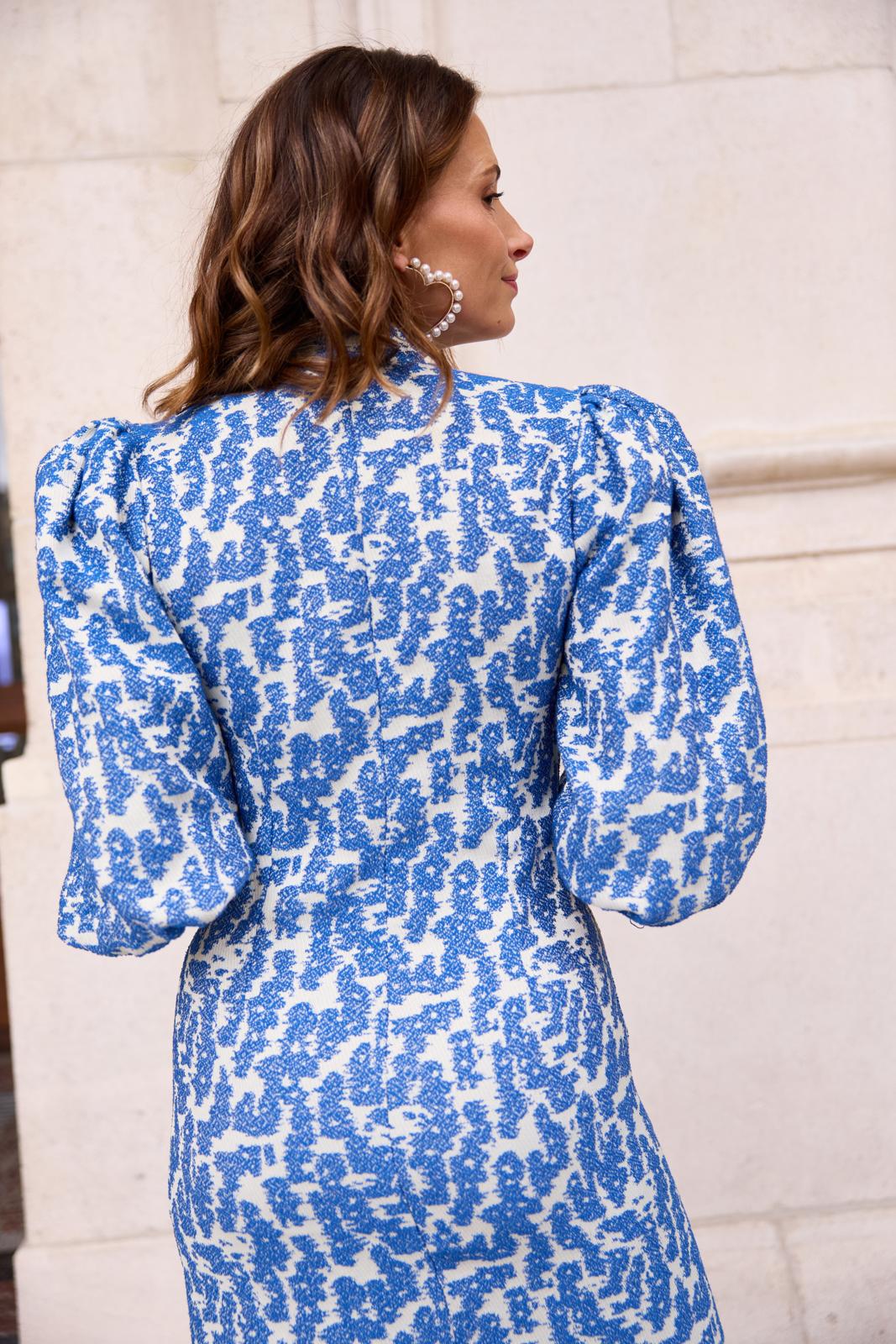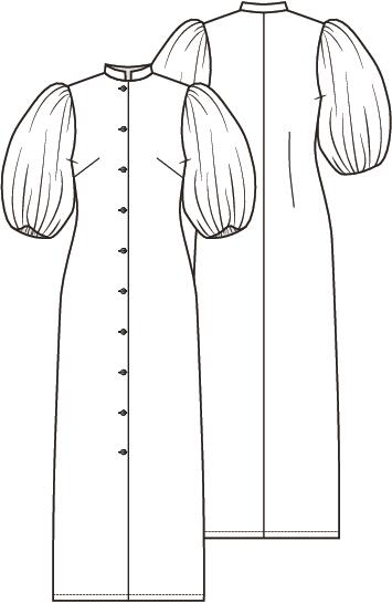 Een doorknoopjurk – meestal een casual jurk - kan ook superchic staan. Zoals dit patroon met opstaand halsboordje. De ballonmouwen zorgen voor een mooi contrast met het slanke silhouet.