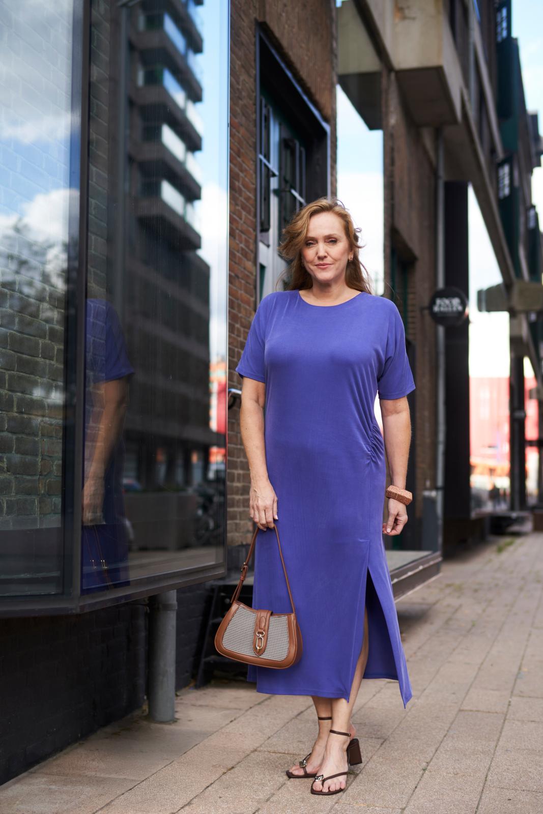 De tricotjurk zit heel comfortabel en staat - met rimpeldetail bij de linkerheup - supervrouwelijk. Een model met aangeknipte mouwtjes en middenachter een blinde rits.