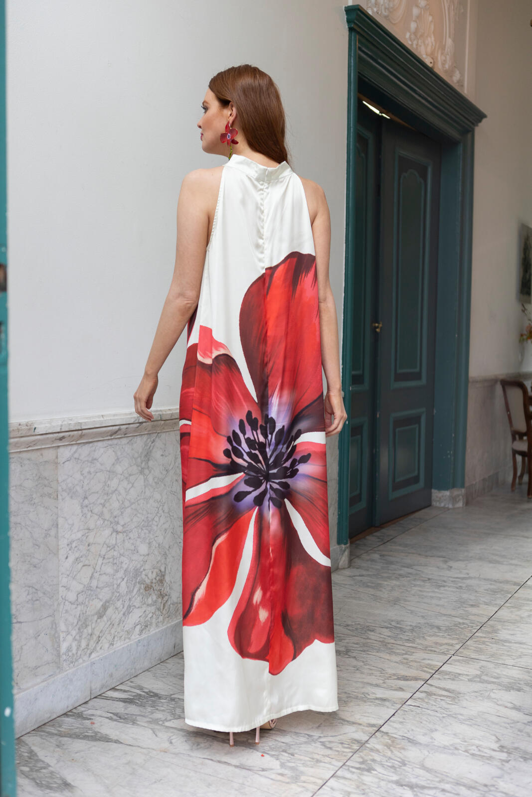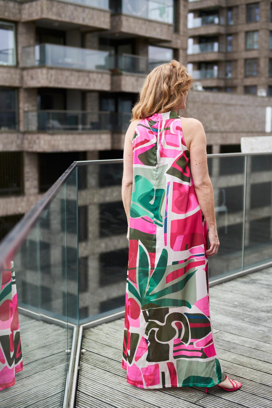 De maxi-jurk met origineel ‘stropdasdetail’ vormt door zijn lengte een perfect palet voor elk XL-dessin. Dus ga voor zo’n reuzenklaproos of een ander groot kleurrijk dessin. Wat je ook kiest: succes verzekerd!