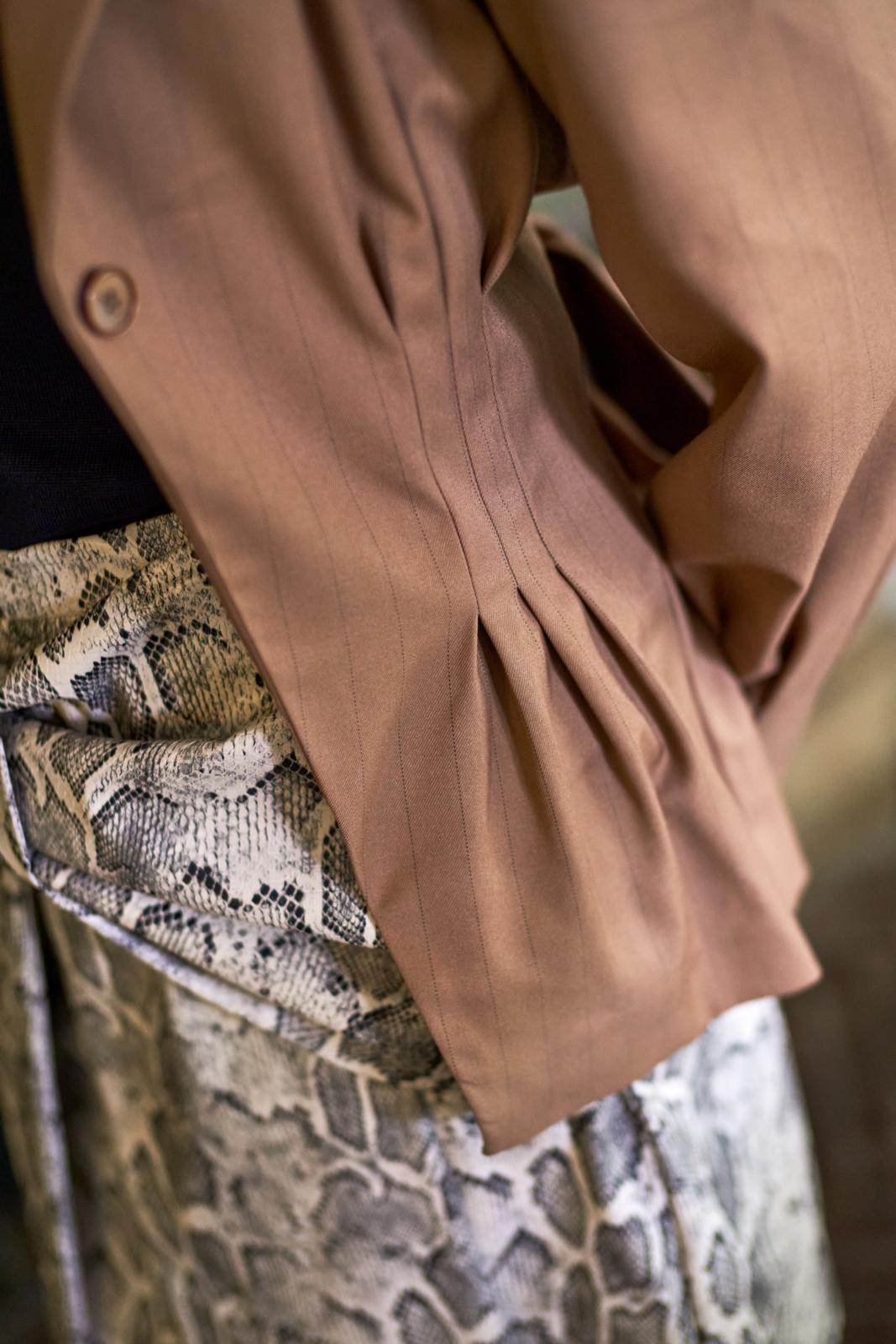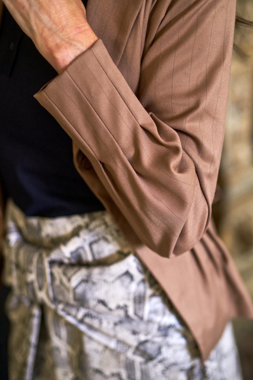 Wij zeggen: doen! Zo'n slanke strikblazer maken in een nieuwe (mokka)bruine trendkleur. Dit jasje - met een krijtstreep - heeft rondom je middel ingestikte plooien en achter lange striklinten. Ook de mouwen zijn onderin voorzien van ingestikte plooitjes.