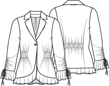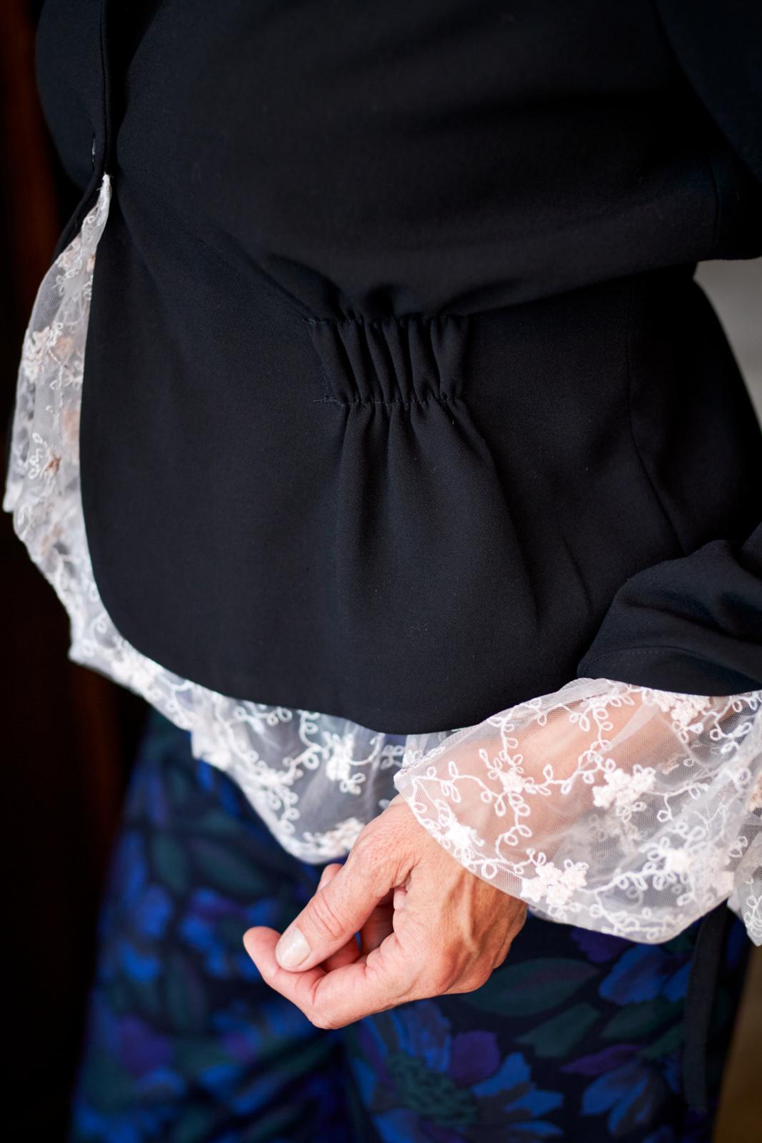 Dit romantische colbert heeft gedeeltelijk elastiek in de taille; de mouwen hebben oprijgjes met strikkoorden. Voor een extra romantische vibe is elegant kant onderaan de mouwen en pandjes gestikt. Dit jasje is gevoerd.