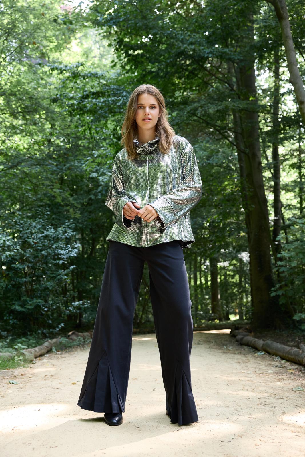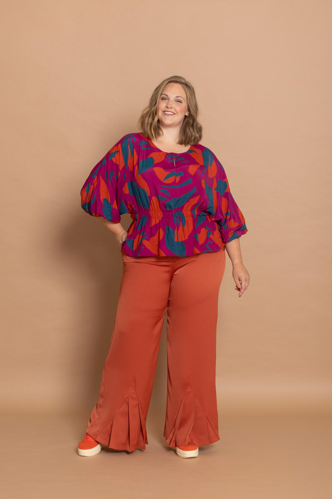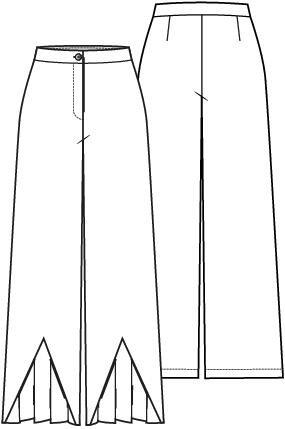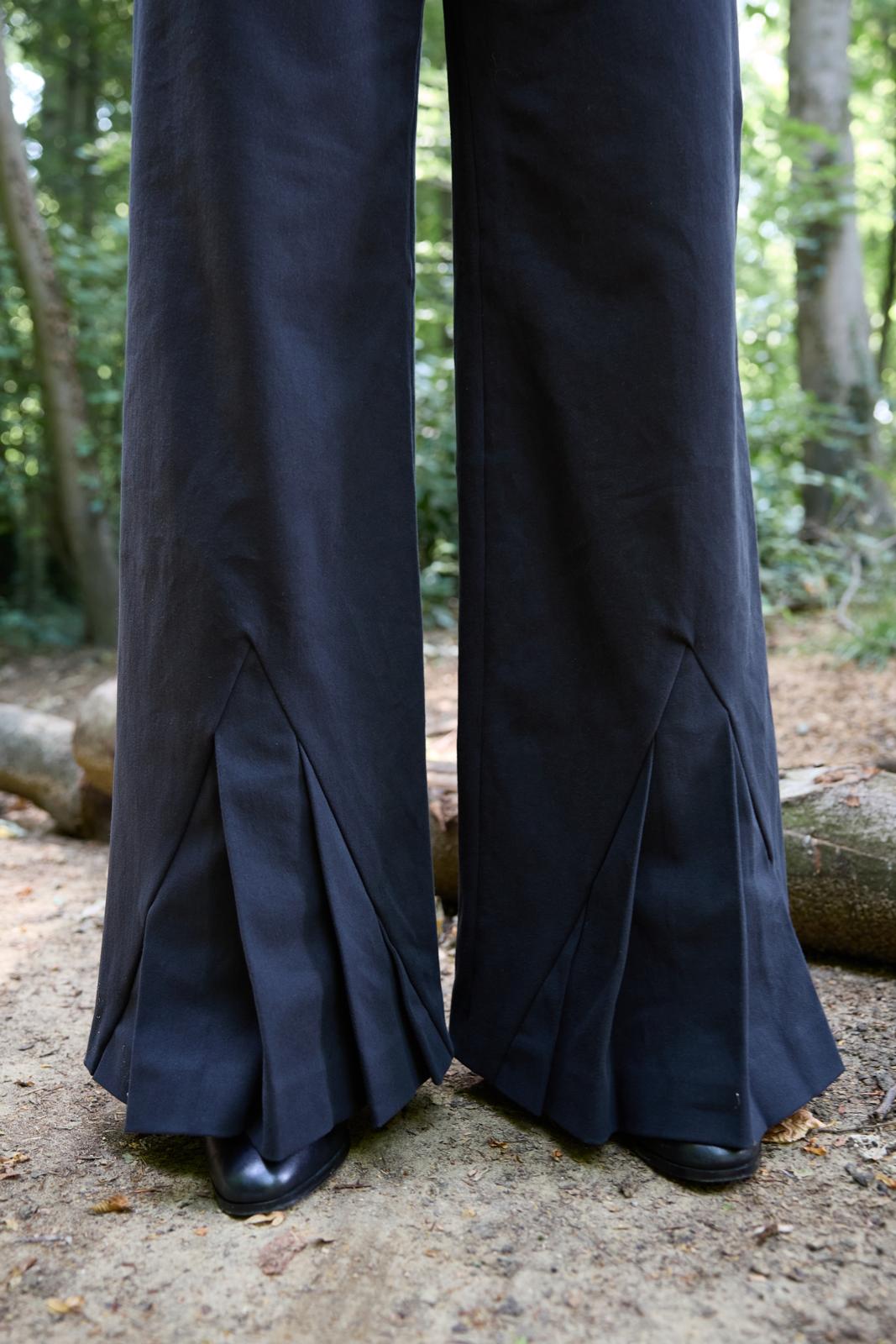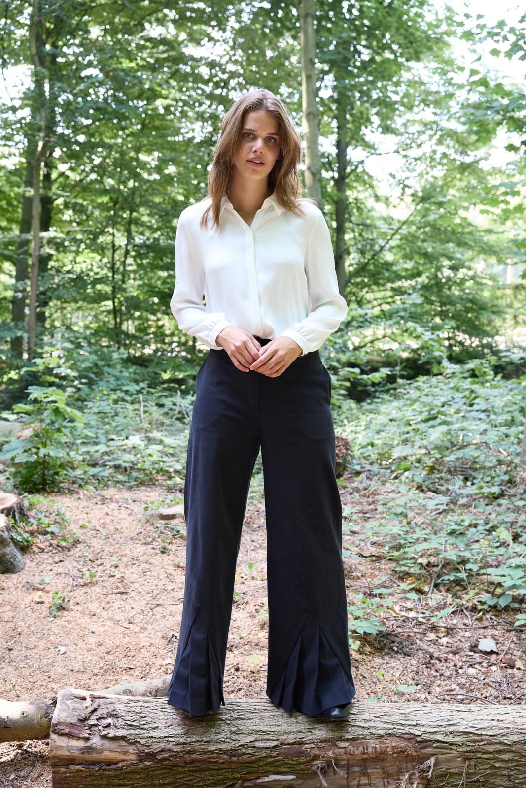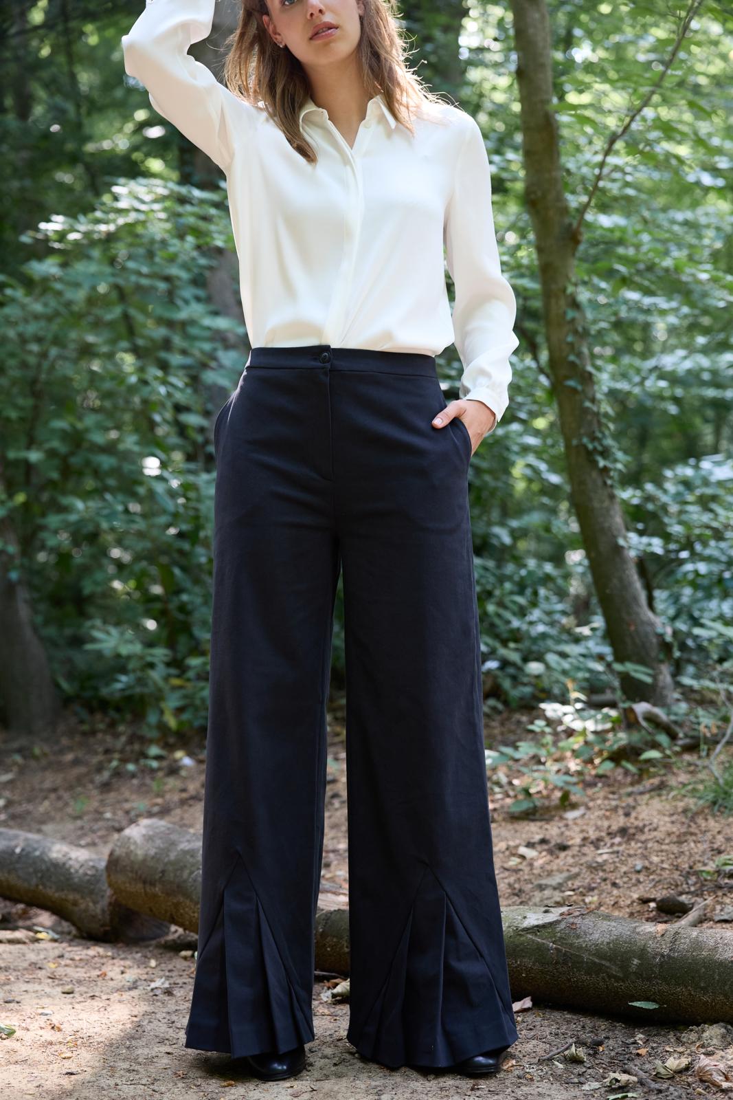 Deze broek heeft een mooie basisvorm; hij valt hoog in de taille, sluit voor met een gulp en heeft achter coupenaden. De ruime rechte pijpen hebben een plissé-inzet onder in de pijpen. Je kunt er ook een basic versie van maken.