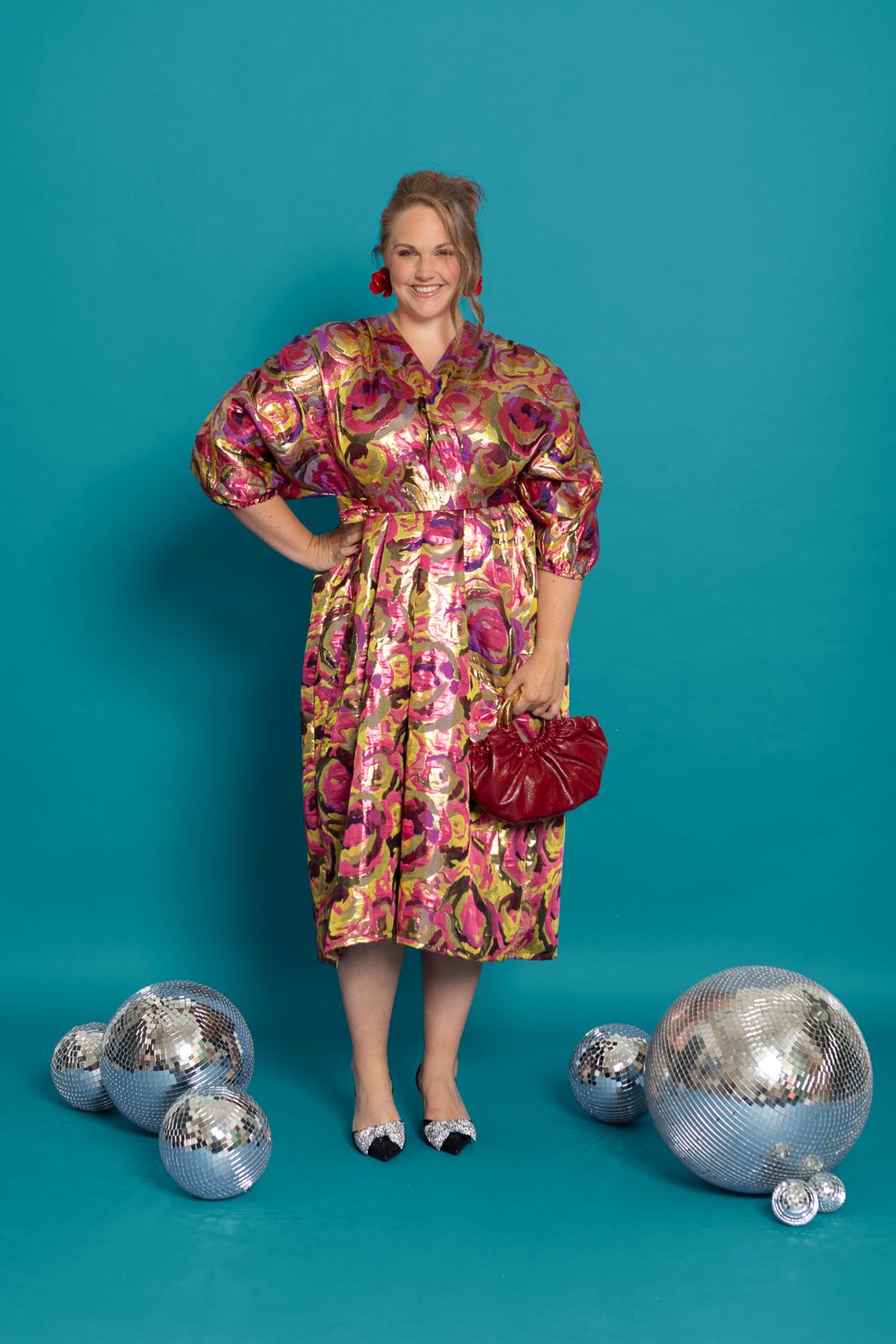 Statementjurk gezocht? In dit feestelijke model met V-hals, pofmouwen, wijde rok én een fantastisch brokaat, steel je gegarandeerd de show. Dankzij de brede strikceintuur accentueer je eenvoudig je taille.