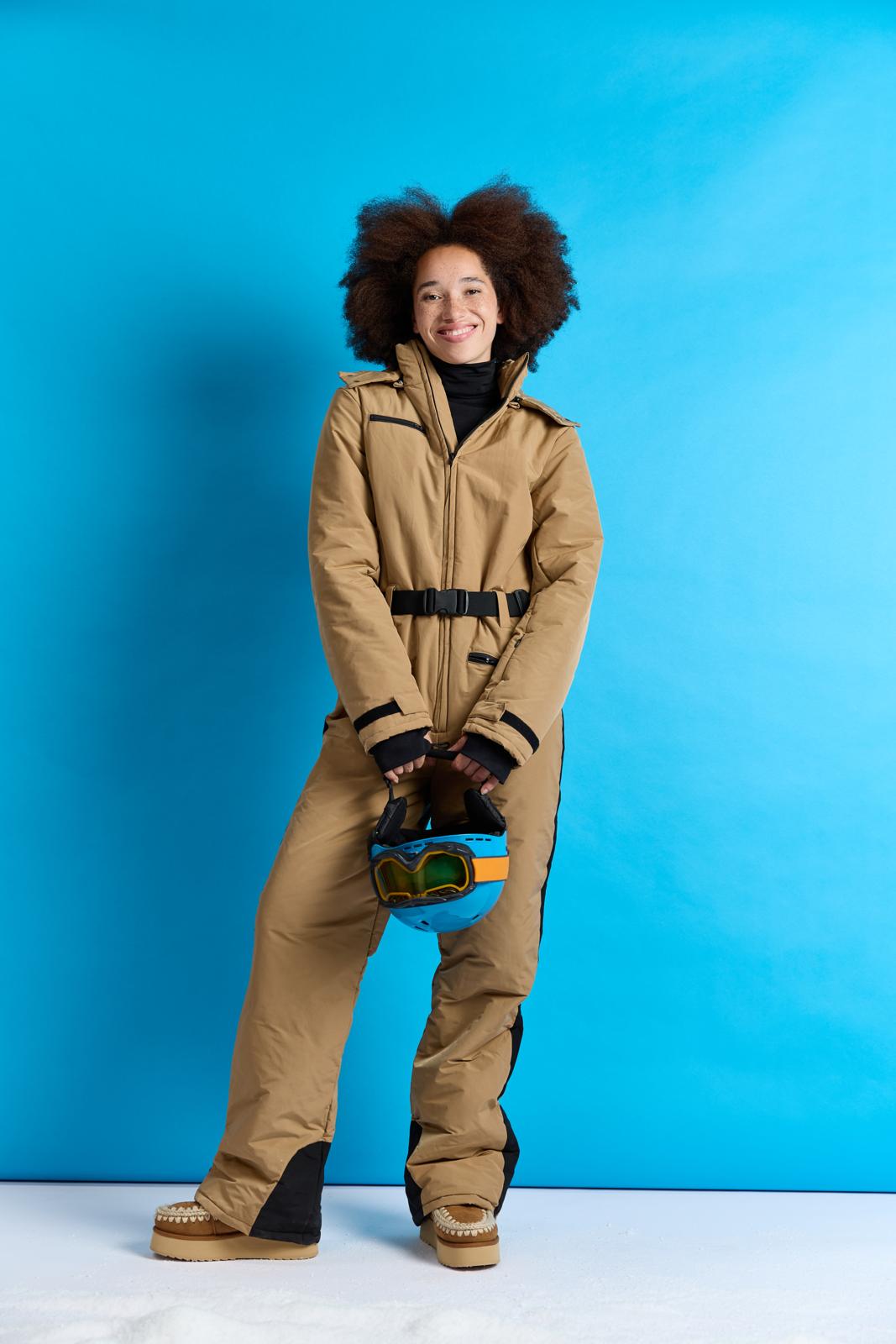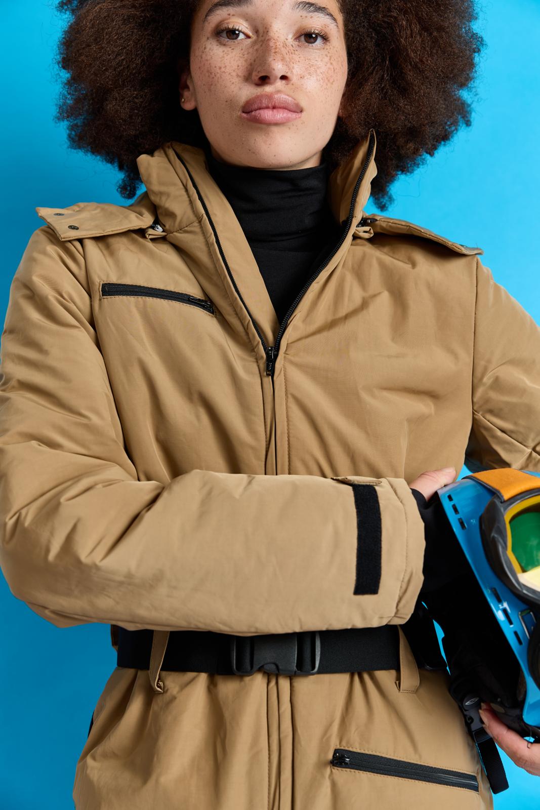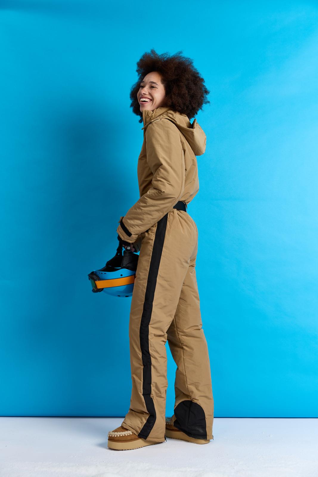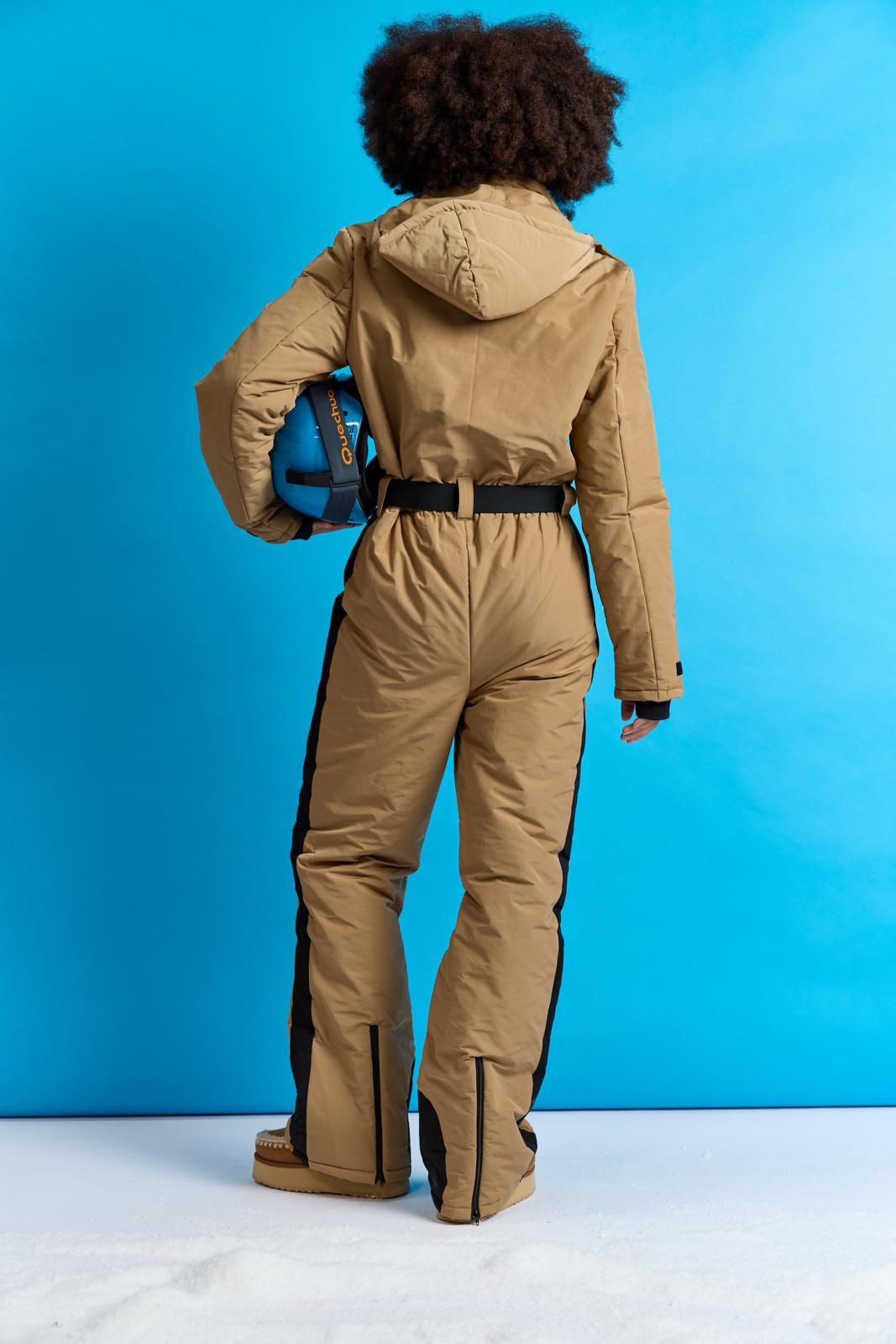 Dit stylish camelkleurige pak met capuchon heeft pit door de zwarte details, zoals: het handige klittenband bij de mouwen en ritsen achter in de broekspijpen. Het pak staat in één kleur uitgelegd in de werkbeschrijving. Wil je een accentkleur (zwart), net als hier? Dan kun je dat zelf toevoegen.