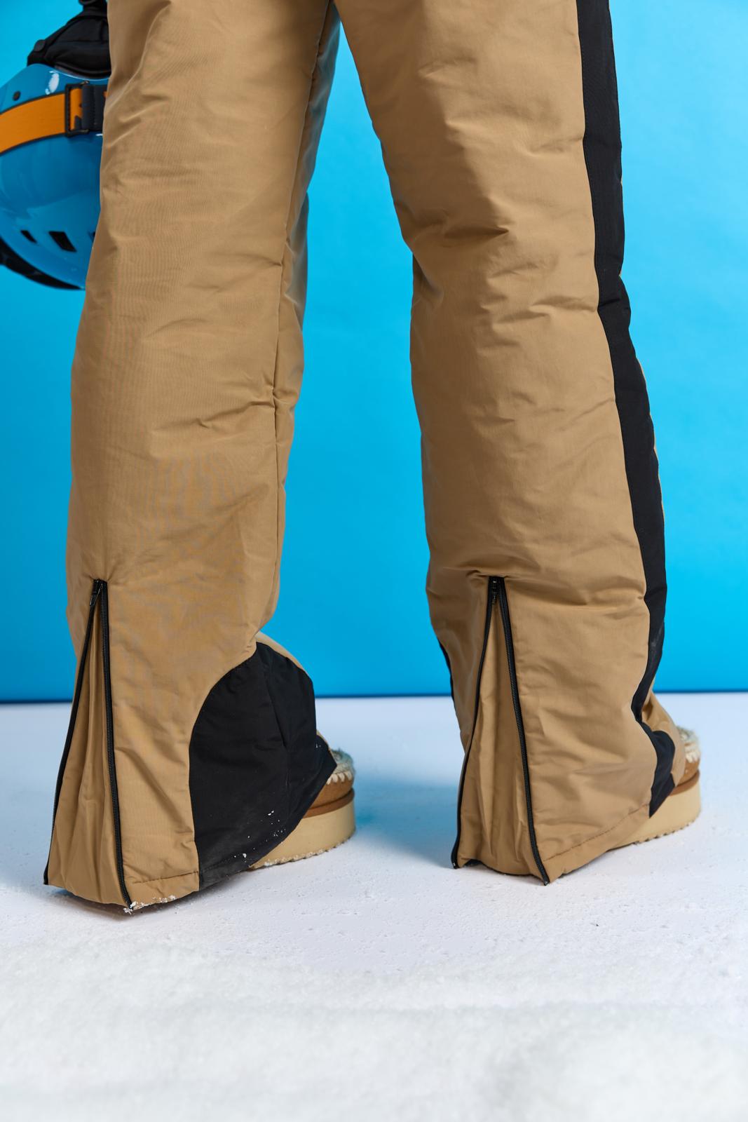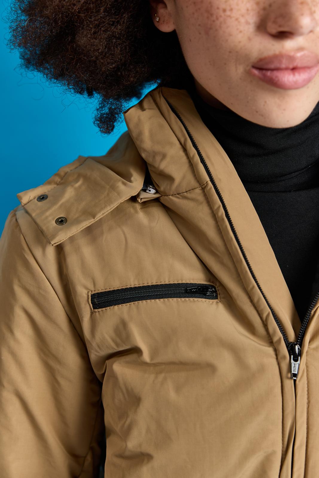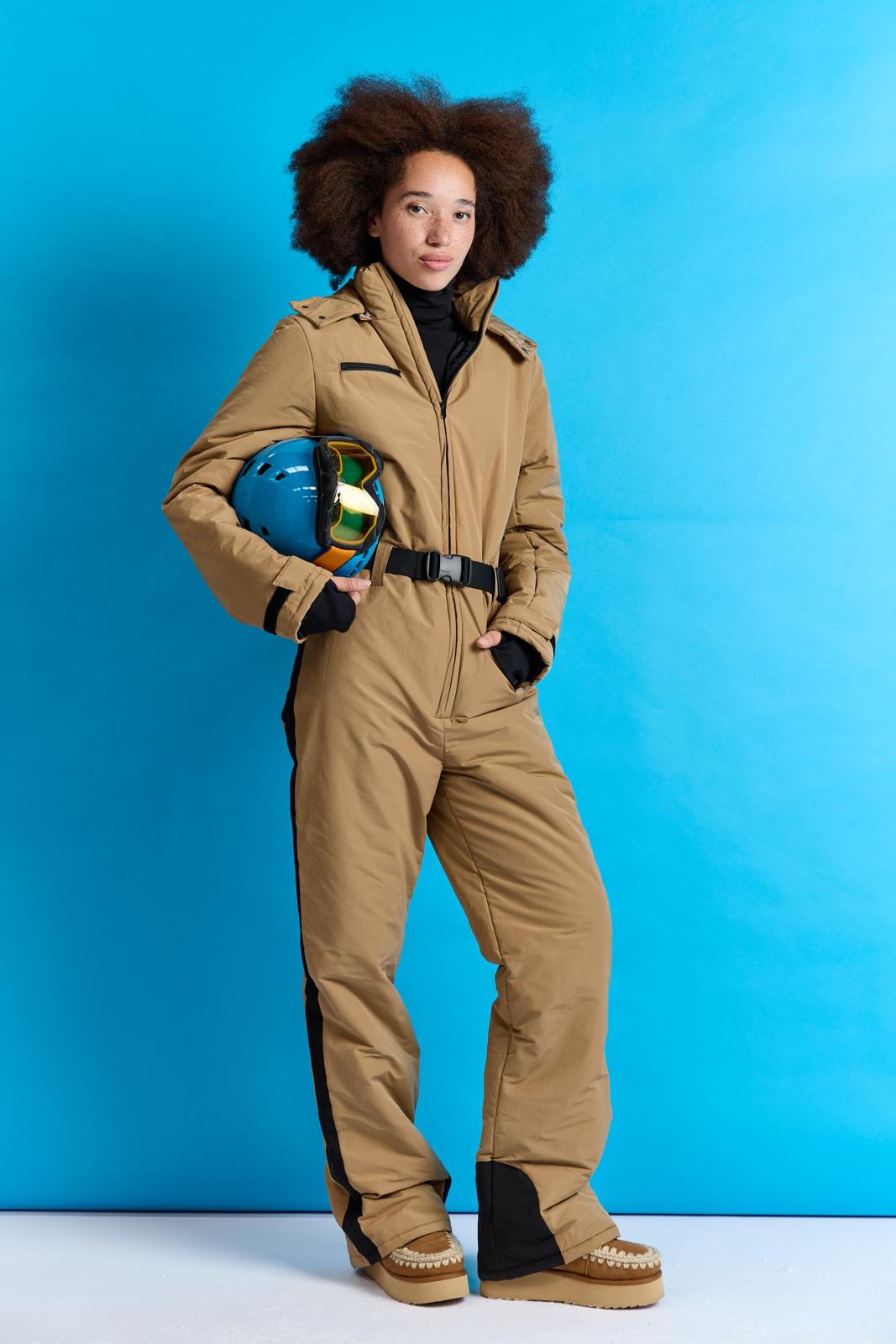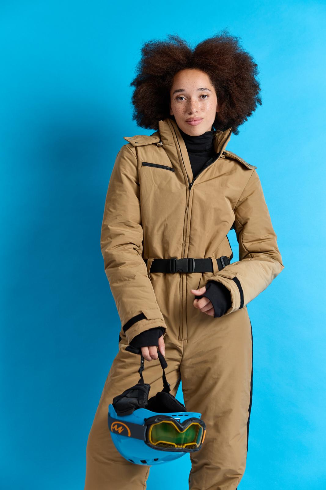 Dit stylish camelkleurige pak met capuchon heeft pit door de zwarte details, zoals: het handige klittenband bij de mouwen en ritsen achter in de broekspijpen. Het pak staat in één kleur uitgelegd in de werkbeschrijving. Wil je een accentkleur (zwart), net als hier? Dan kun je dat zelf toevoegen.