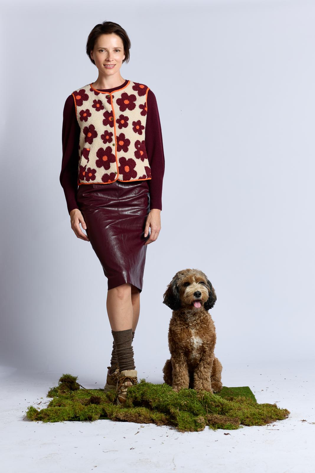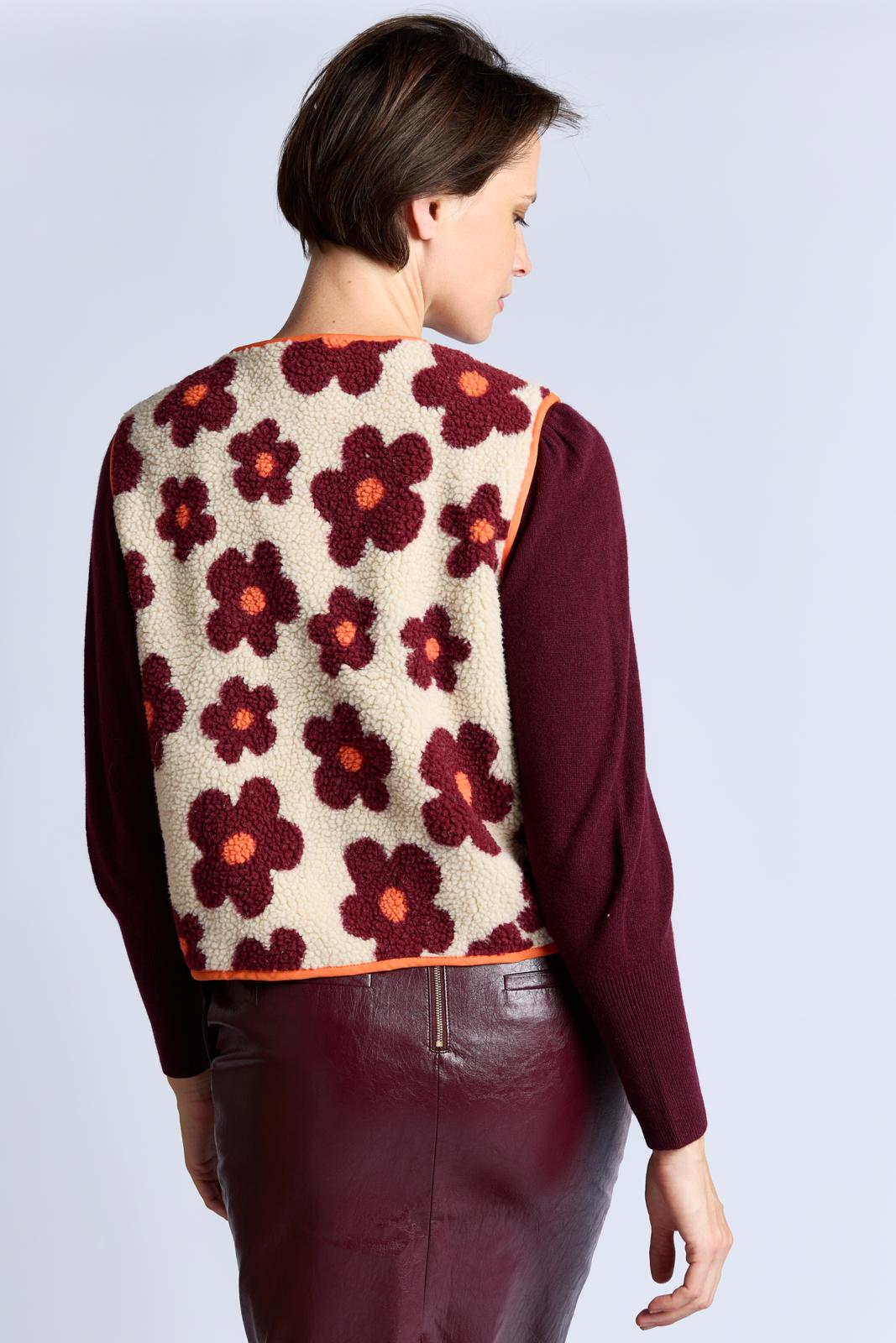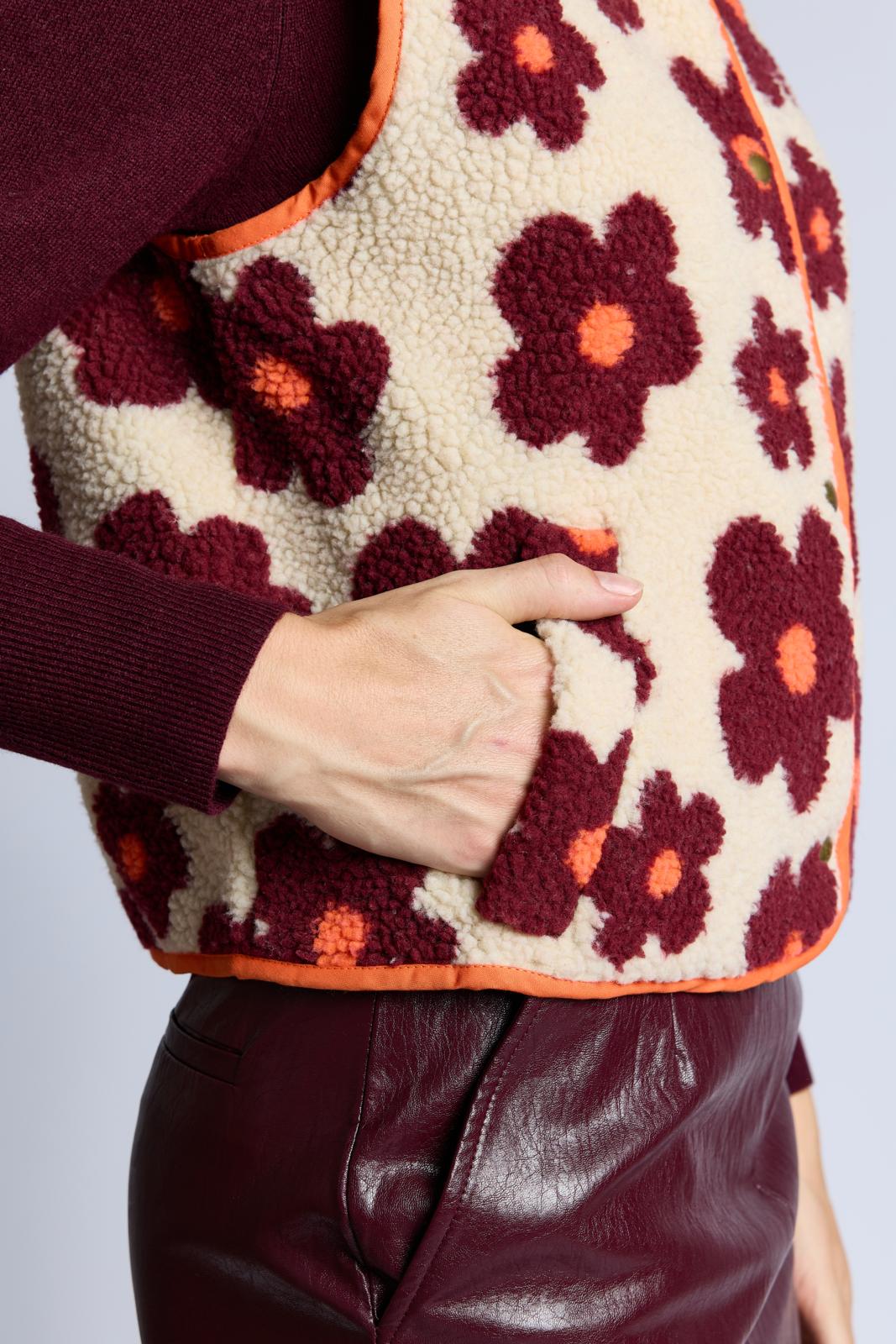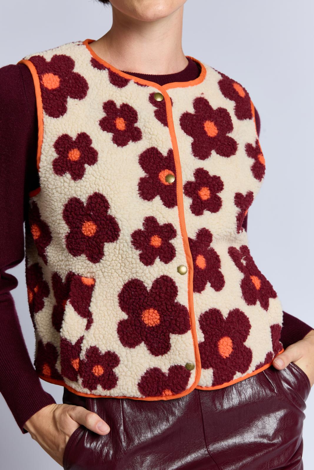 Of je dit mouwloze vest nu van langharig imitatiebont maakt of van teddy met een print, hier ga je zeker veel plezier van hebben. Dit exemplaar is langs de randen afgewerkt met oranje katoenen biaisband. Het heeft strookzakjes en sluit met drukknopen.