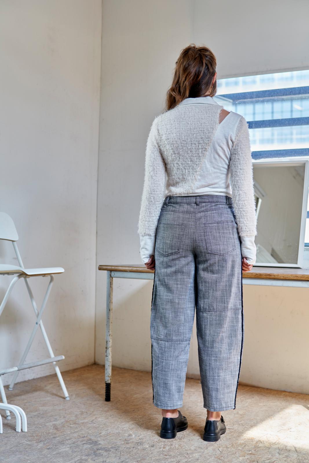 De barrel leg broek is hét nieuwe basismodel. Een stoere casual broek met ‘ronde pijpen’, achter een heuppas en opgestikte zakken. W.b. de donkerblauwe broek met sierrandje op de zijnaad; hier is de zelfkant van de stof – met rafeltjes – voor gebruikt.