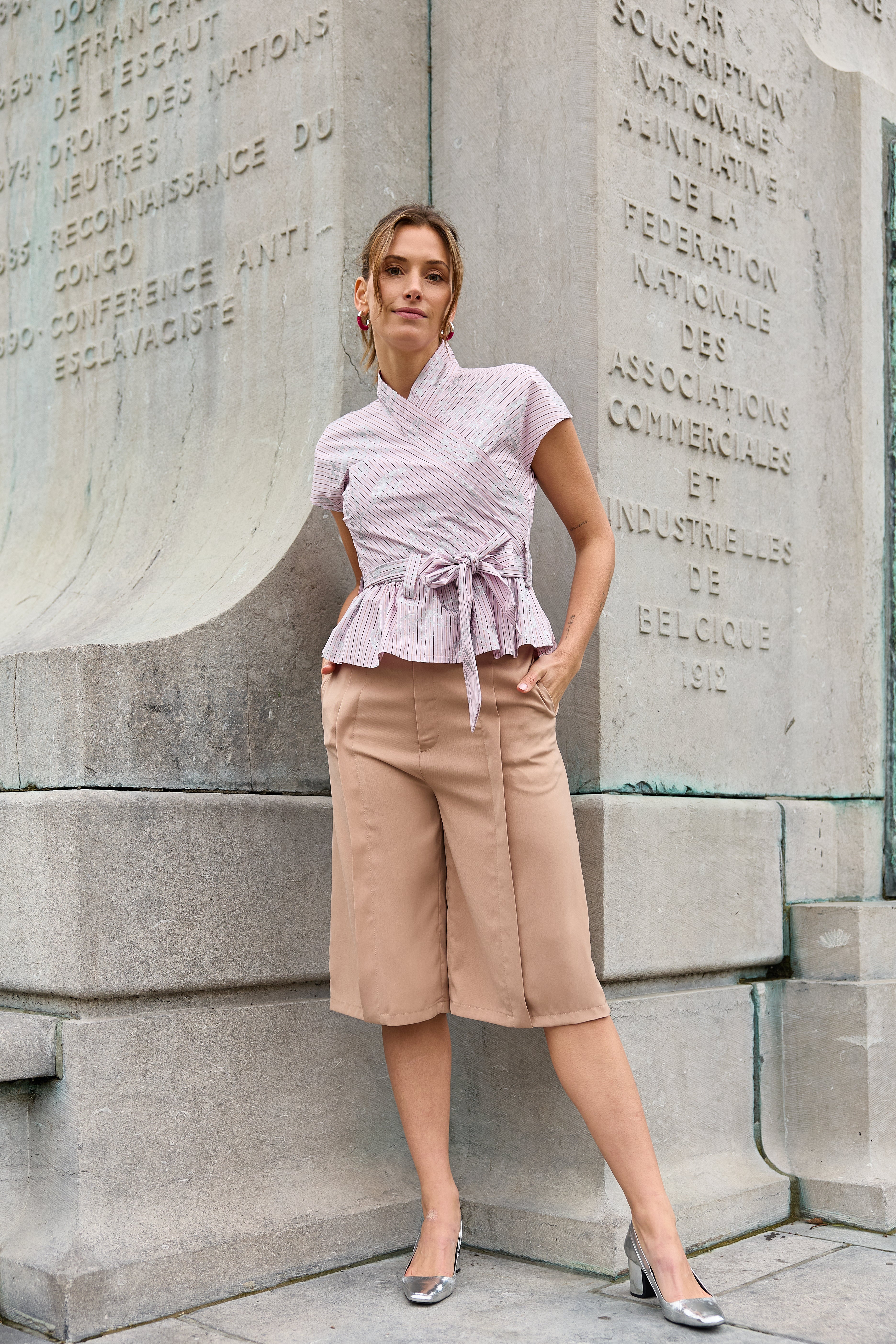 Een elegante slanke top met opstaande halslijn en overslageffect. Vanwege de overslag zit de ritssluiting in de rechterzijnaad.
