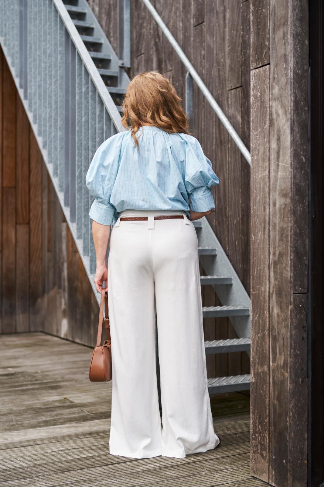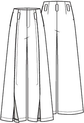 Deze broek heeft een actueel silhouet met wijde pijpen. De taille is afgewerkt met een beleg en riemlusjes. Over de lengte van de pijpen is een sierplooi ingestikt. Het split in de pijpen kun je eventueel dicht stikken.