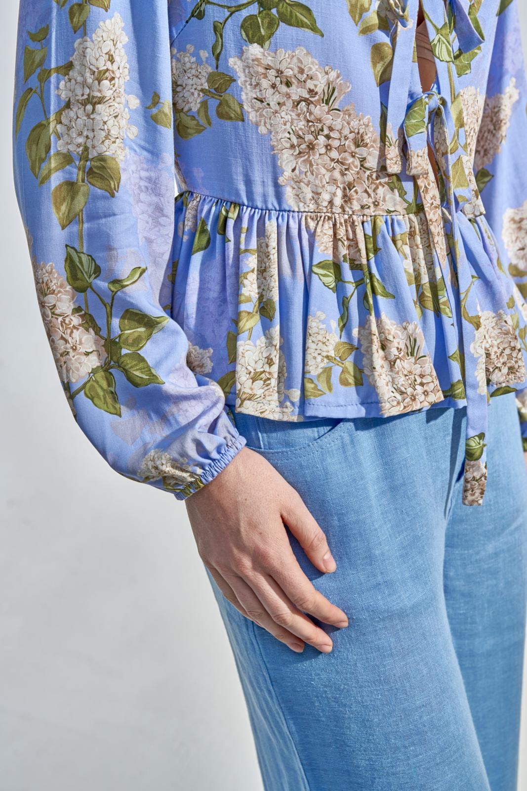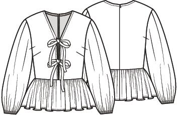Deze sierlijke top met peplum heeft voor een diepe V-hals met striklinten voor de sier. Hij gaat aan met een lange blinde rits achter. De mouwen poffen door het elastiek onder in het zoompje.