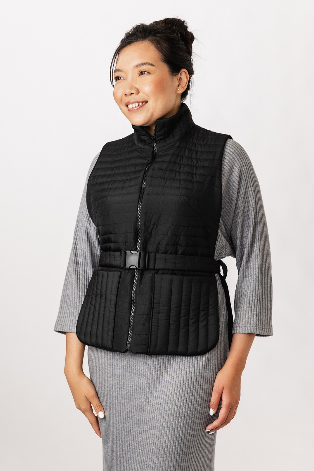 De bodywarmer heeft een hoge kraag met ritssluiting, opgestikte zakken en een ceintuur met een klikgesp voor een moderne, sportieve look. De voering zorgt voor extra draagcomfort, en de volledig open zijkanten geven het ontwerp een eigentijdse twist. Een veelzijdig en modieus item dat warmte en stijl moeiteloos combineert!